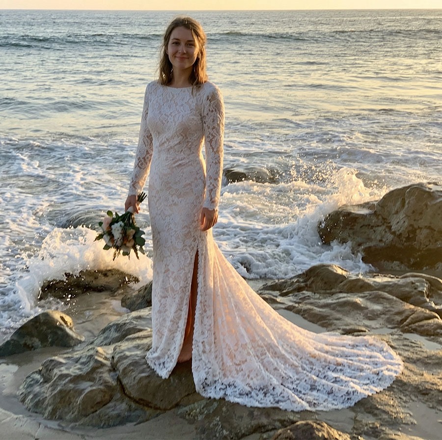 OMG, this lace wedding dress is a dream! The long sleeves and slit make it elegant yet comfy. The fit was perfect—true to size. If you love timeless romance, grab it! Got tons of compliments on my big day. 💖