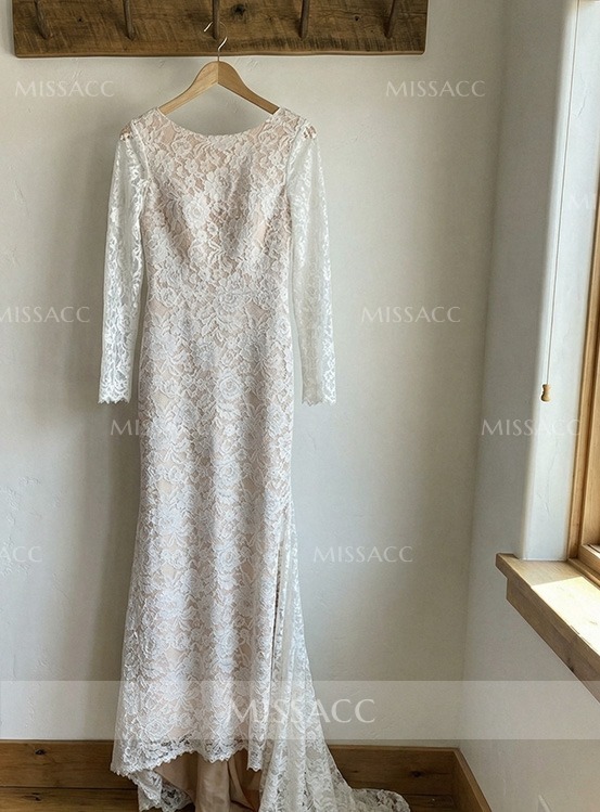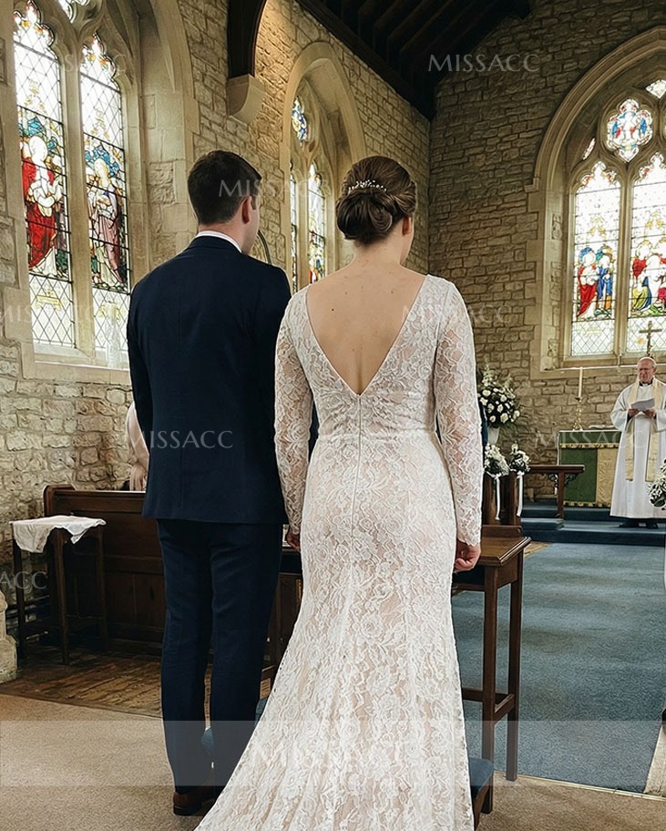 Stunning lace long-sleeve wedding dress with an open back and court train. Timeless elegance for your special day.