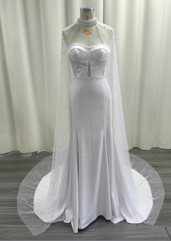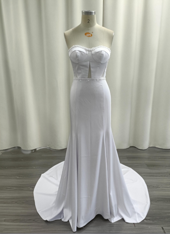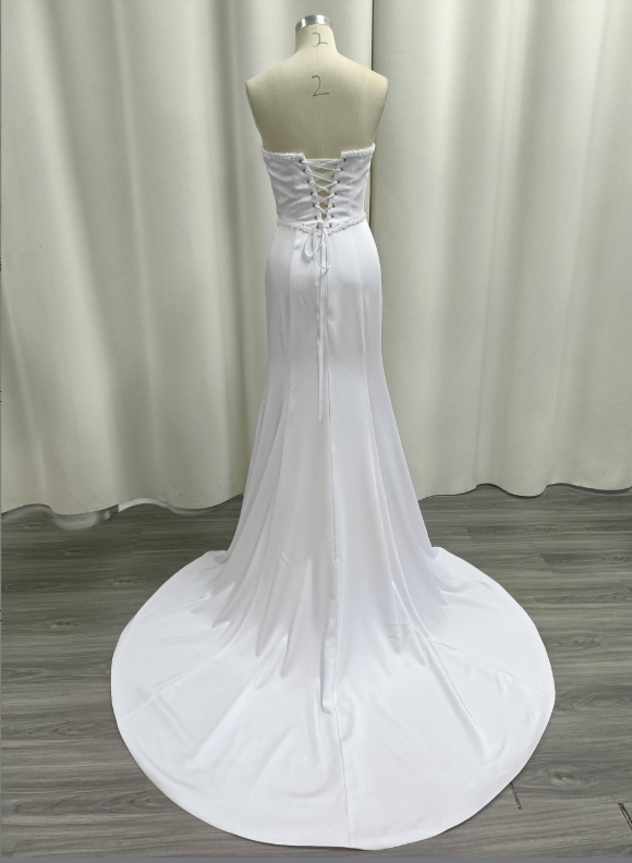 Luxurious Italian satin mermaid wedding dress featuring a romantic sweetheart neckline and dazzling beaded wrap. This sophisticated bridal gown with a sweep train is perfect for modern formal weddings. Shop this stunning satin bridal dress for your special day.