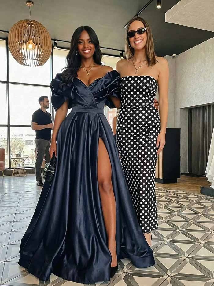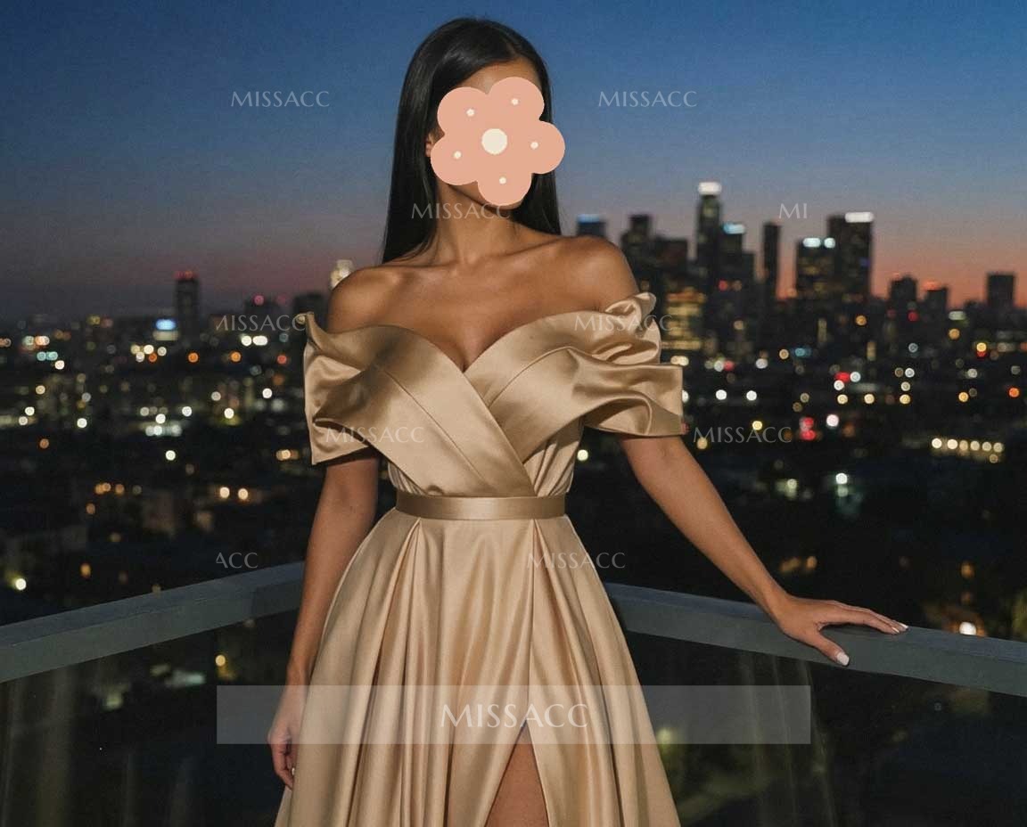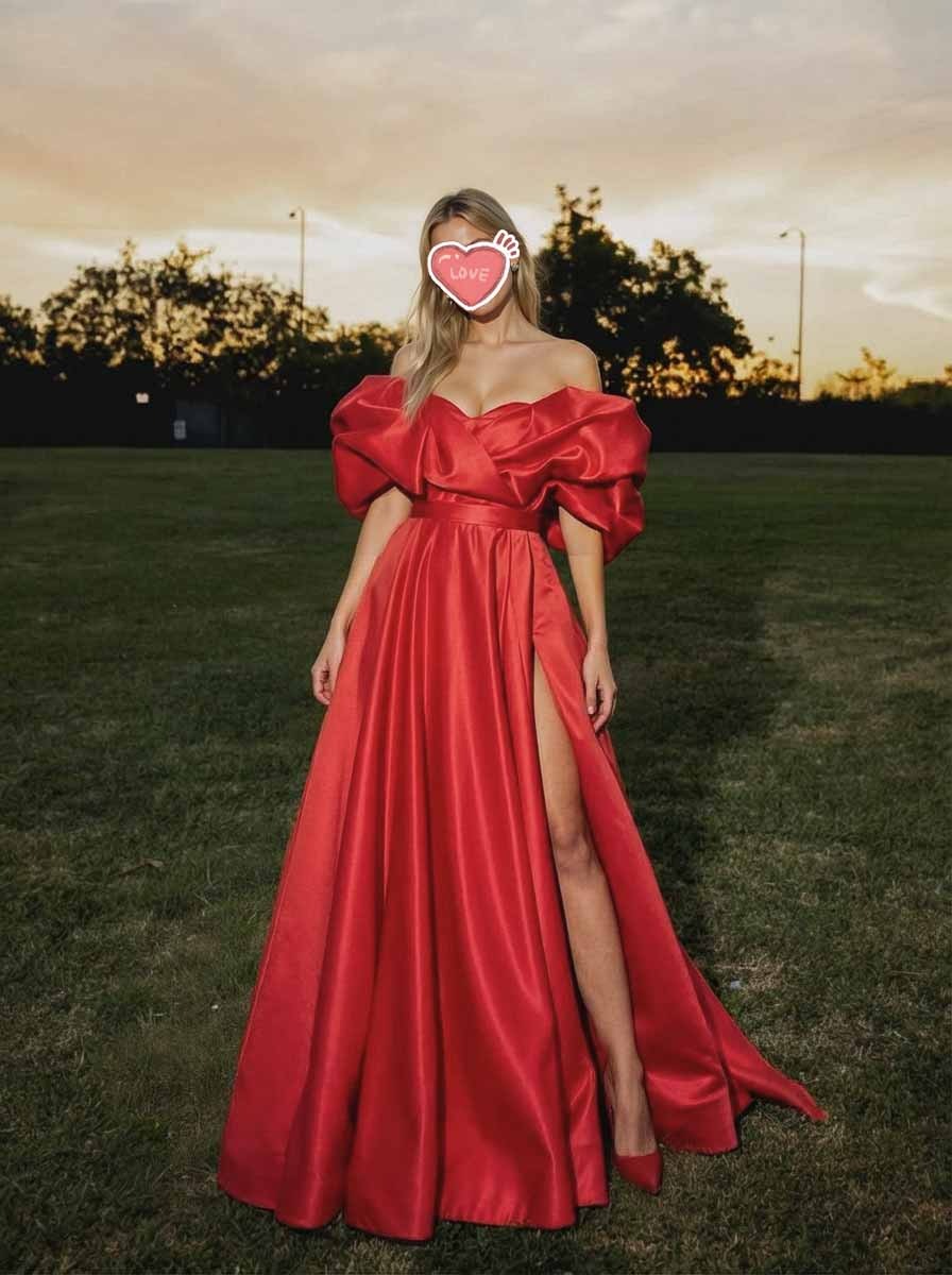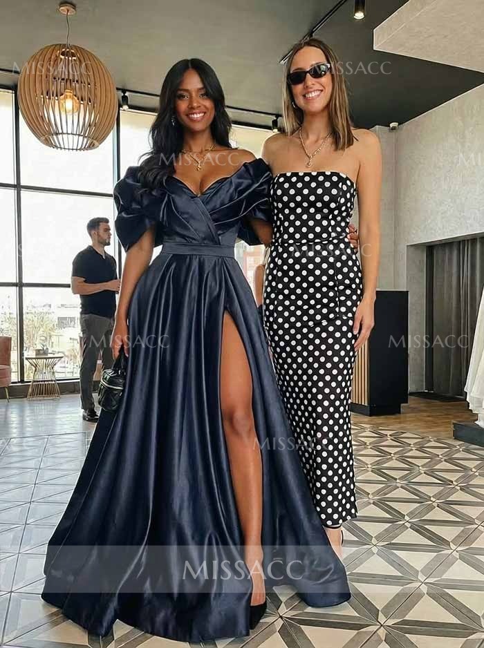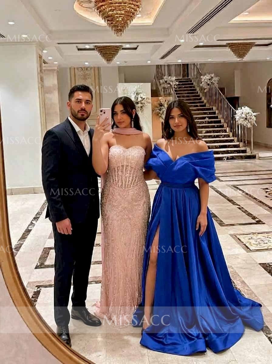 Find strapless glamor with our satin A-line slit prom dress, perfect for flaunting elegance at your next special event. Crafted from luxurious satin, this dress features an A-line silhouette that accentuates your figure and an off-the-shoulder design that adds a touch of elegance without being ostentatious. The subtle slit at the hemline offers a hint of seduction for an effortless, graceful stride.