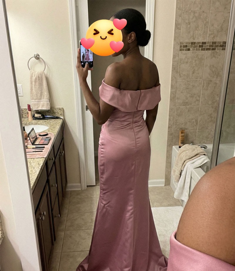 This is truly one of the best dresses I've ever bought. The off-shoulder style is really flattering and the sweep train is the perfect length. Plus, it's super comfortable. I'd definitely recommend this!