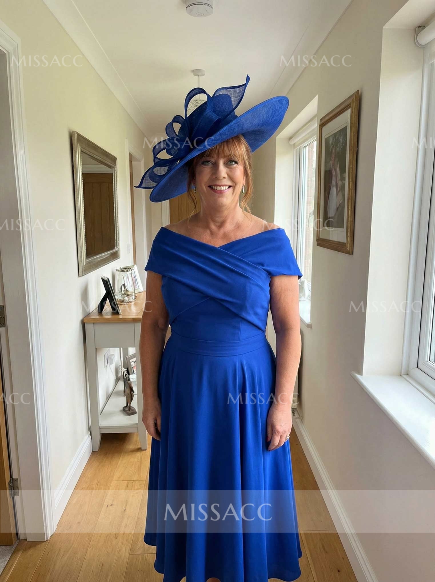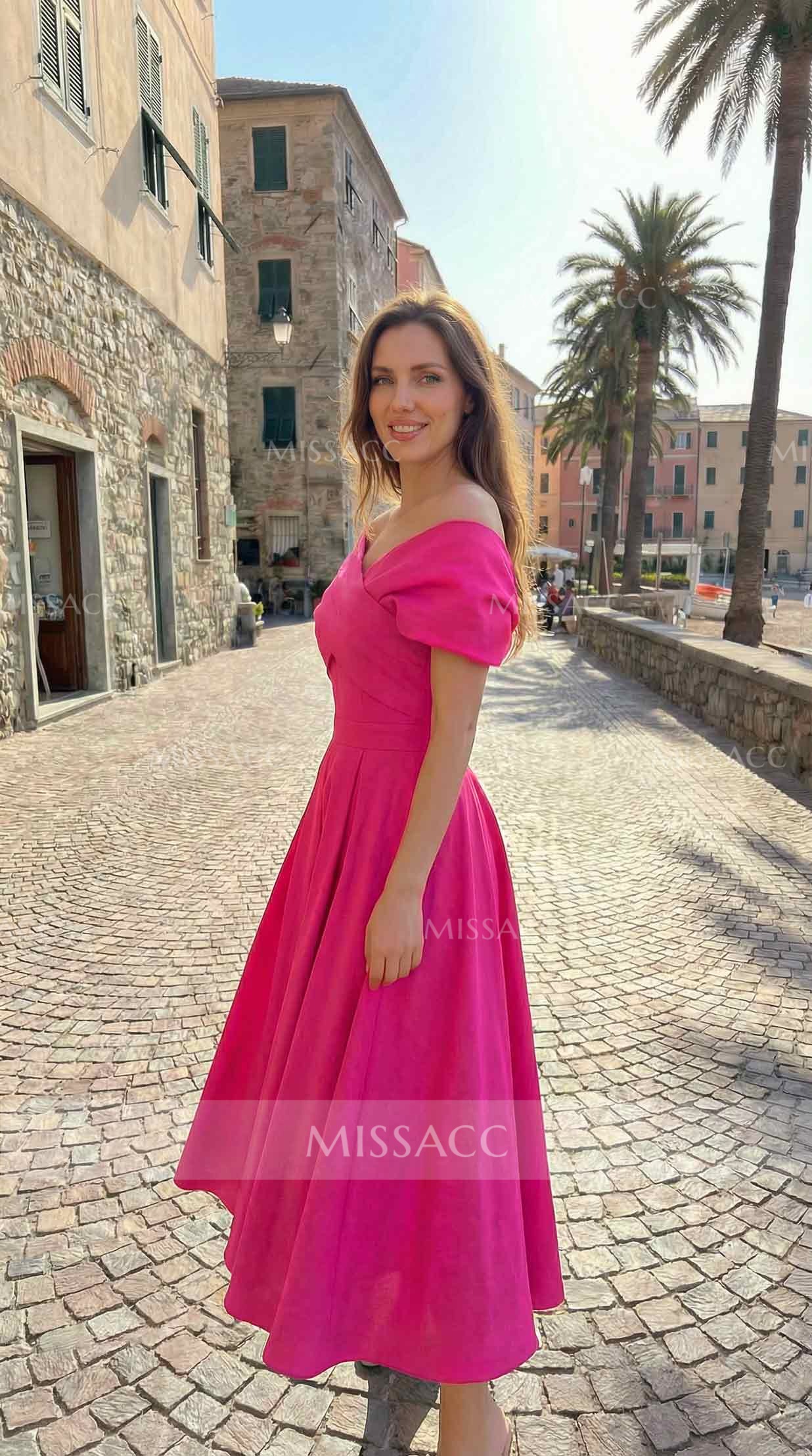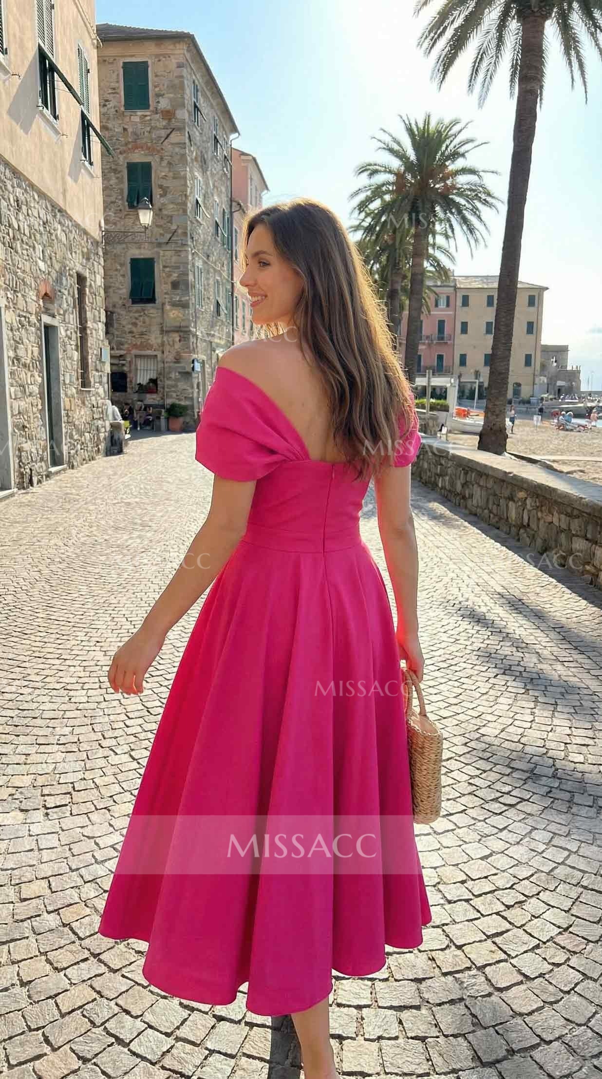 Off-The-Shoulder Tea-Length Elastic Satin A-Line Cocktail Dresses