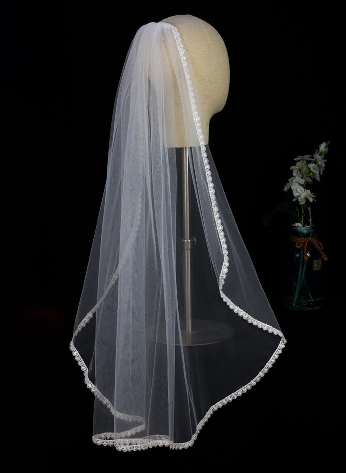 One-Tier Ivory Tulle Angel Cut/Waterfall Lace Applique Edge Fingertip Bridal Veils #SVE10059