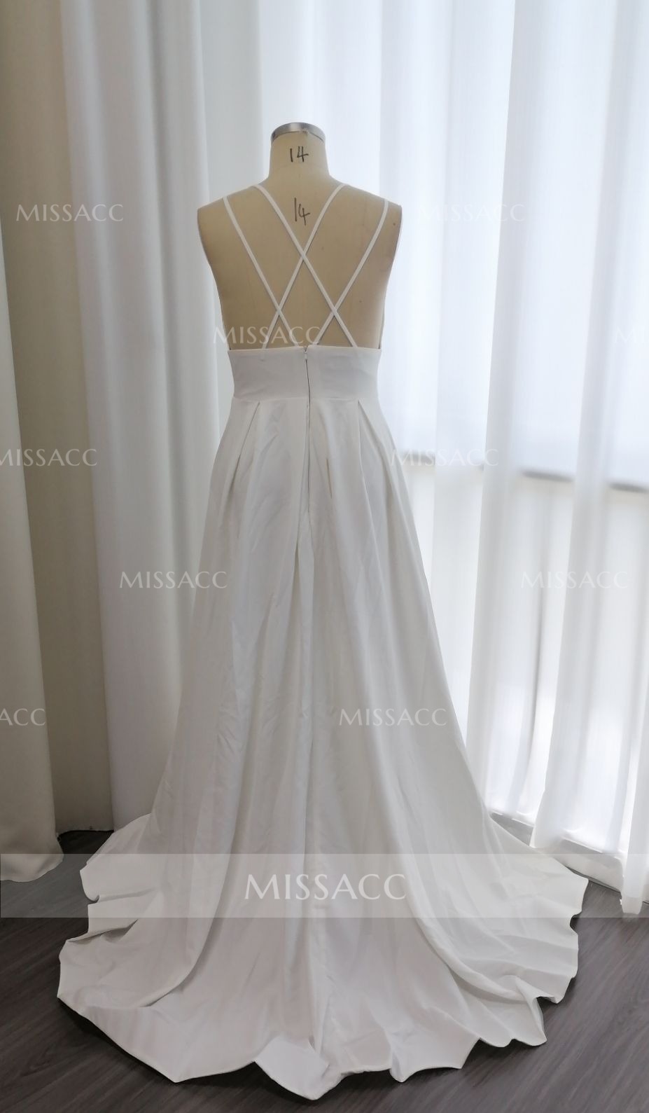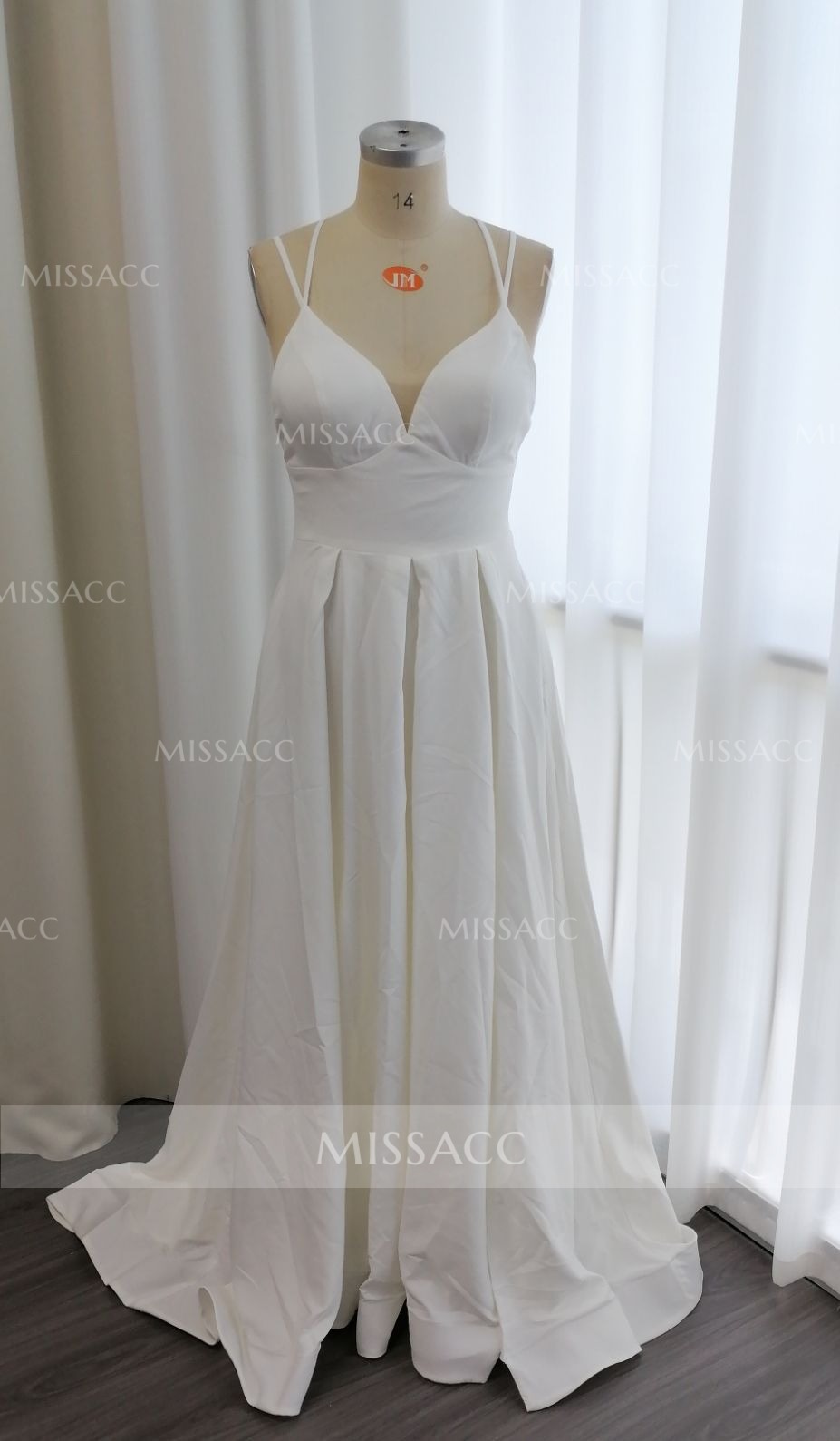 Stunning A-line wedding dress in a soft v-neck design with open back and spaghetti straps for a romantic, timeless look perfect for your special day.