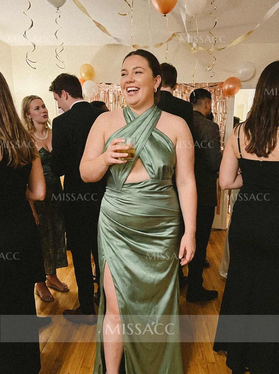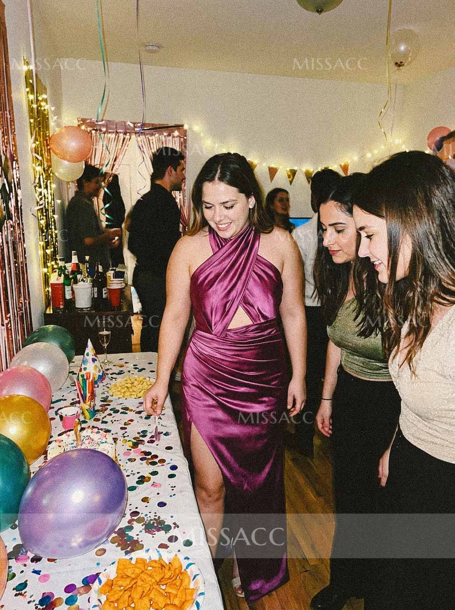 Stunning high-slit satin prom dress, crafted from luxurious silk-like material for a smooth, elegant silhouette. This halter style dress features a chic design, perfect for a glamorous evening event.