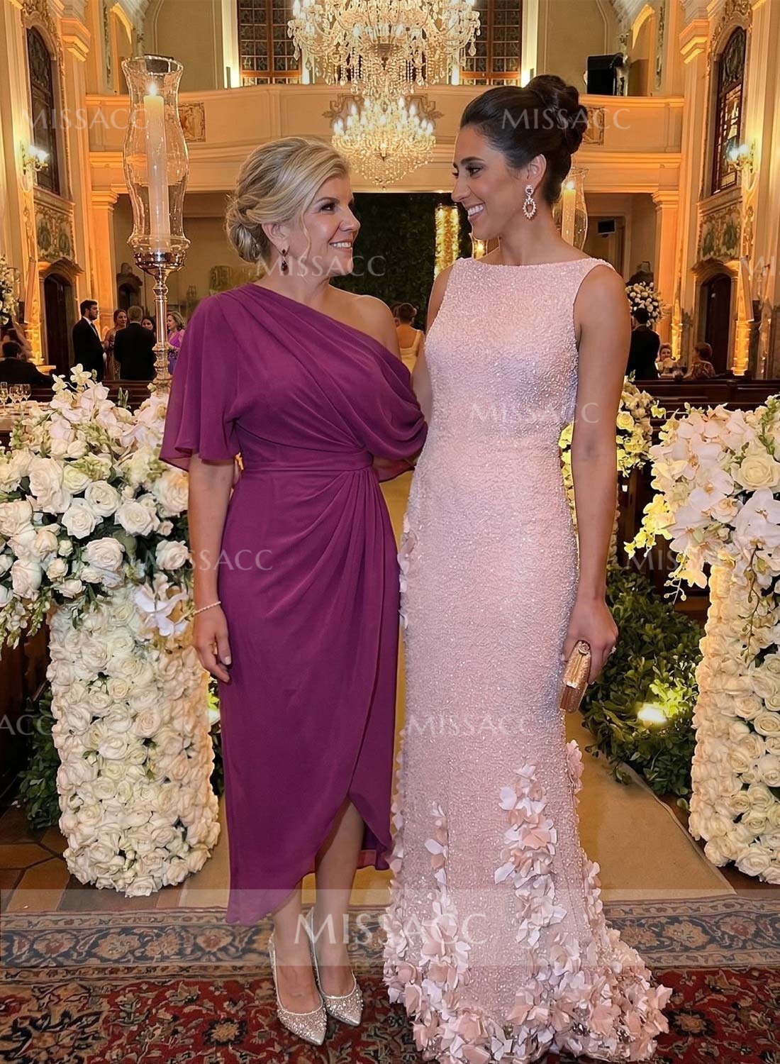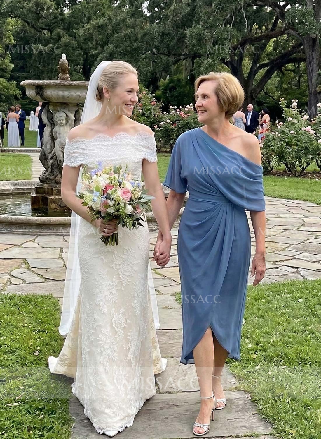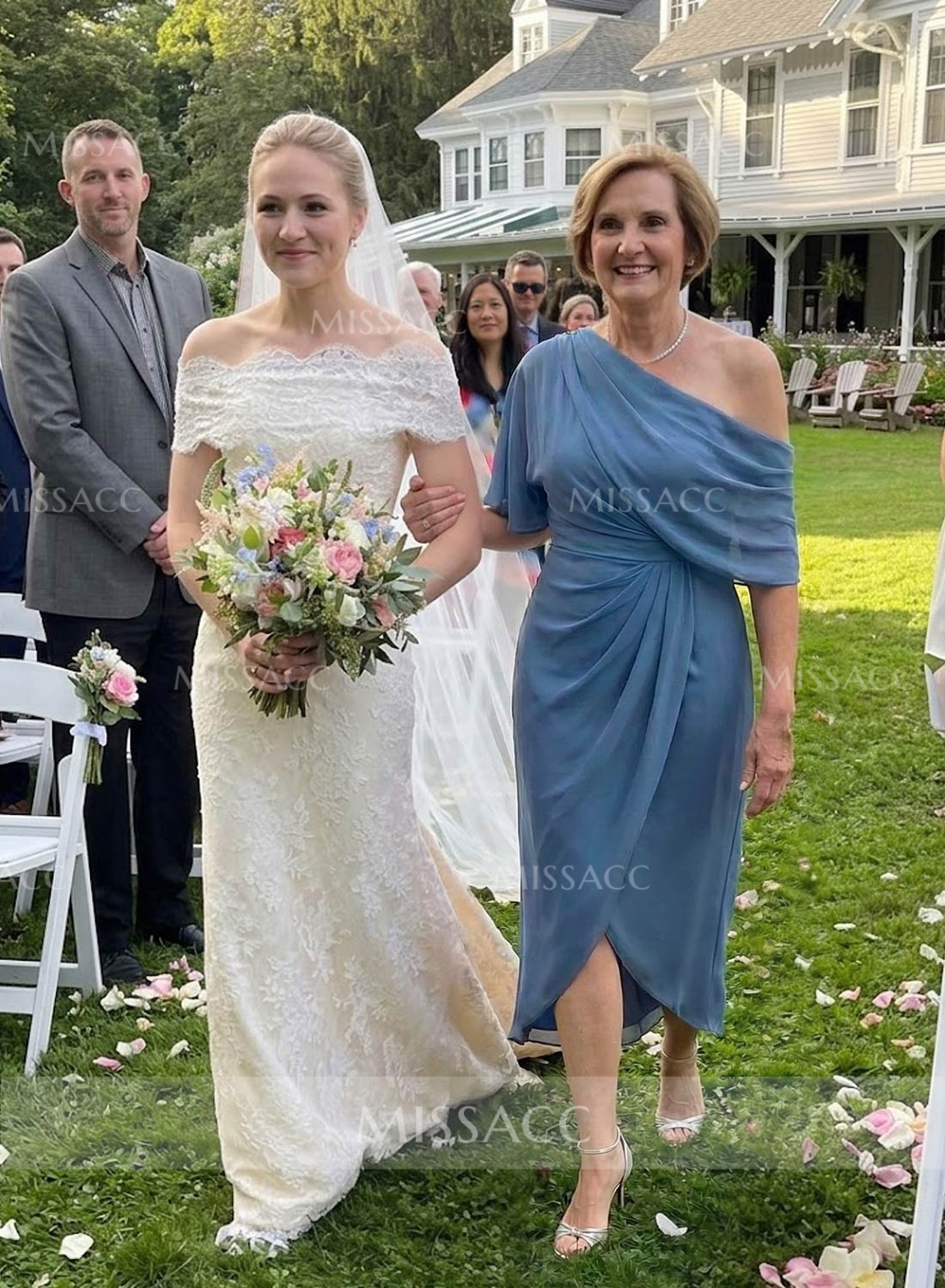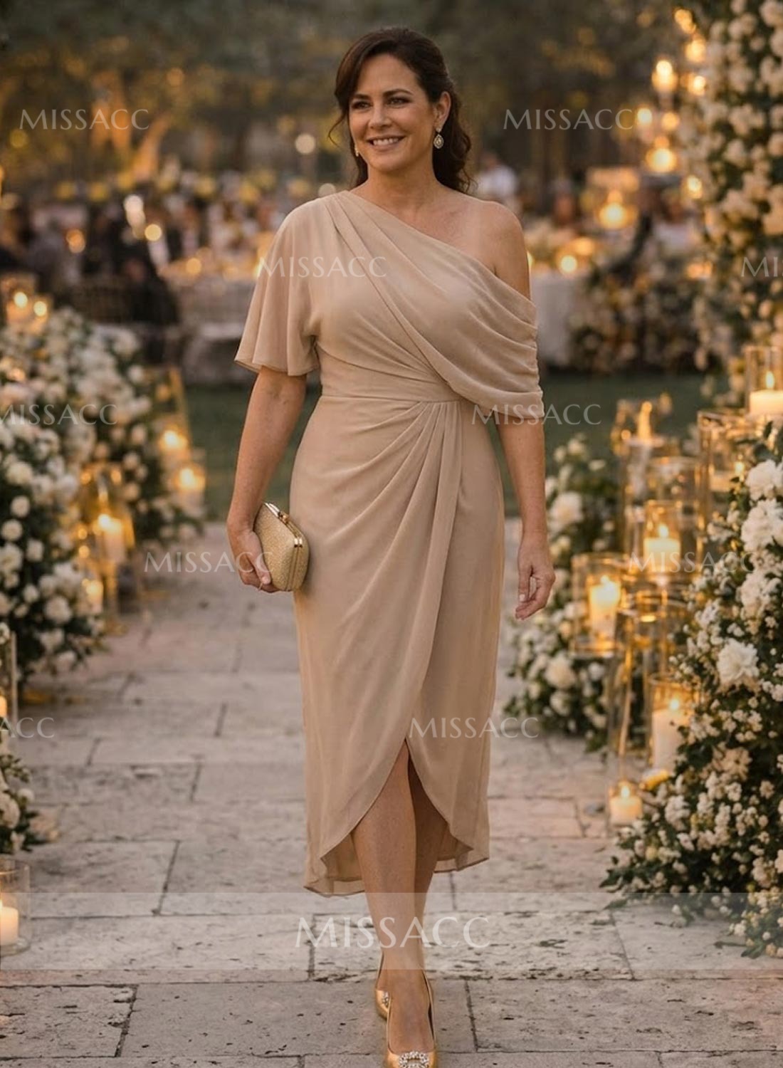Let me just say, this dress was an absolute hit at the reception! I was struggling to find something age-appropriate yet modern, and this column silhouette hit the mark perfectly. The chiffon is lightweight but not see-through at all. Shipping took about two weeks, which gave me plenty of time to find matching shoes. When I finally put it all together, I felt absolutely beautiful. The split front gives it just enough movement for dancing. If you're on the fence, just buy it. You won't regret it!👍👍