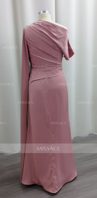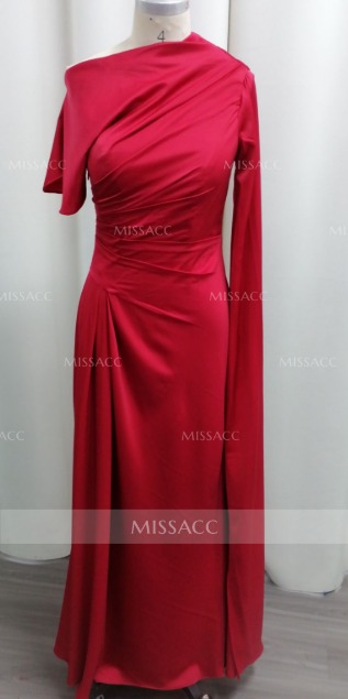 Sheath column evening dress with asymmetrical sleeves in Crepe Satin fabric, with elasticity,perfect for special occasions.