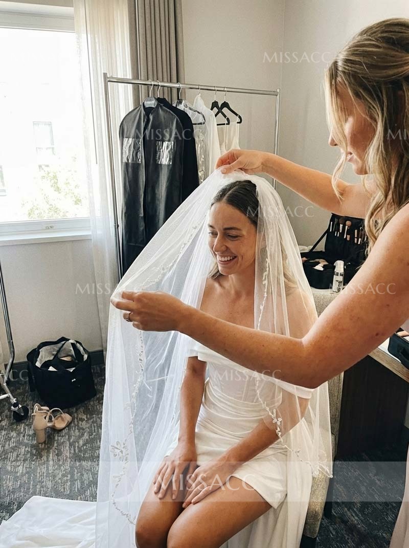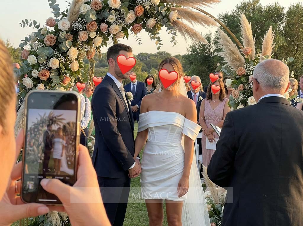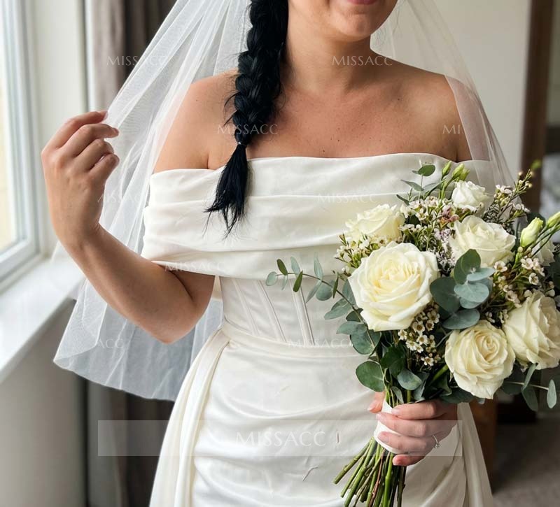 The wedding dress is a striking blend of elegance and modern style. The bodice features exposed boning, beautifully complemented by pleated fabric over bust cups.Off-the-shoulder sleeves enhance the romantic feel.And the detachable train adds sophistication. With exposed boning and bra cups for support, this gown also features a court-length train, making it perfect for the bold bride who wants to make a statement on her special day.
