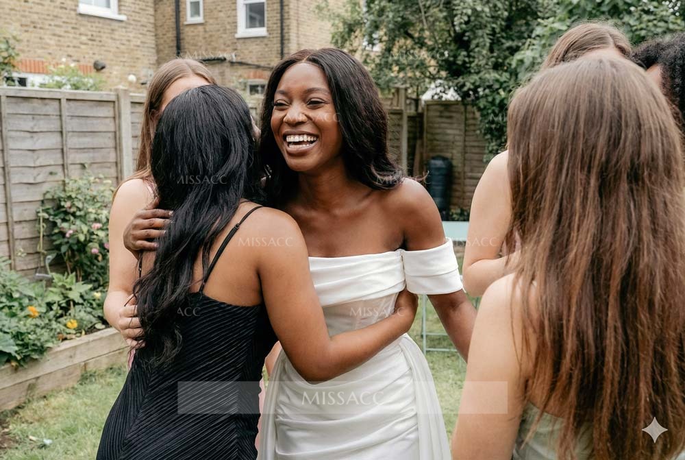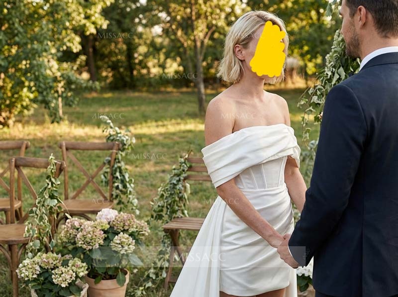 Just got this off-the-shoulder dress and it's a real charmer! The satin fabric feels smooth and the detachable part adds a nice touch. Fits well, not too tight, not too loose. Would definitely recommend for a special occasion.