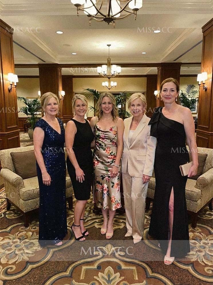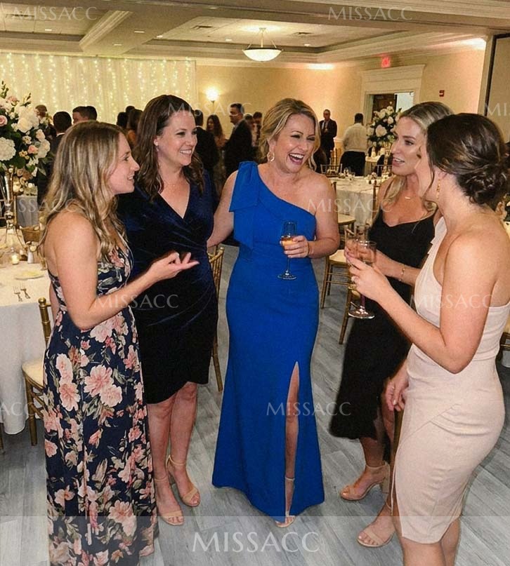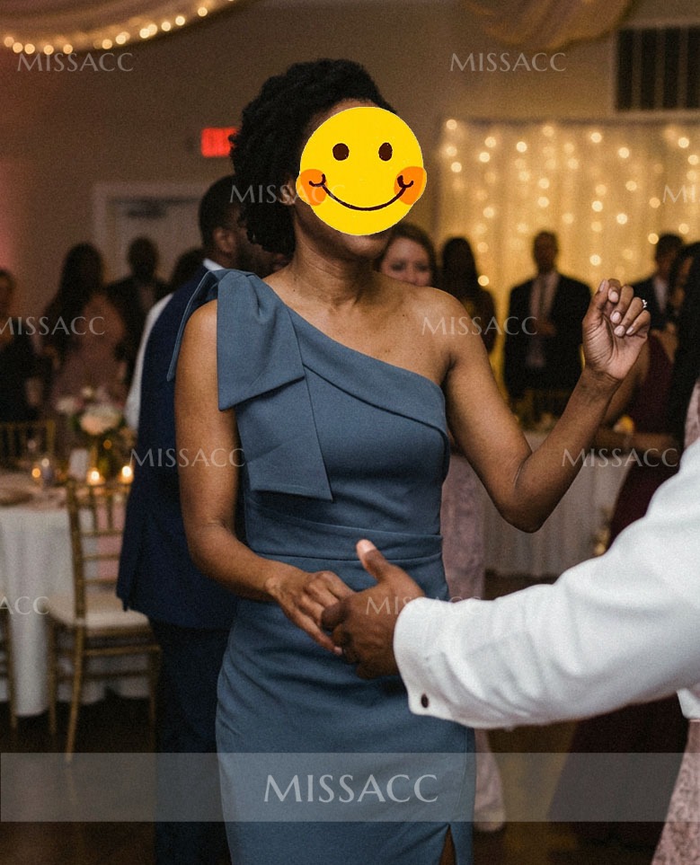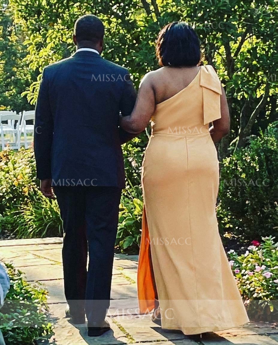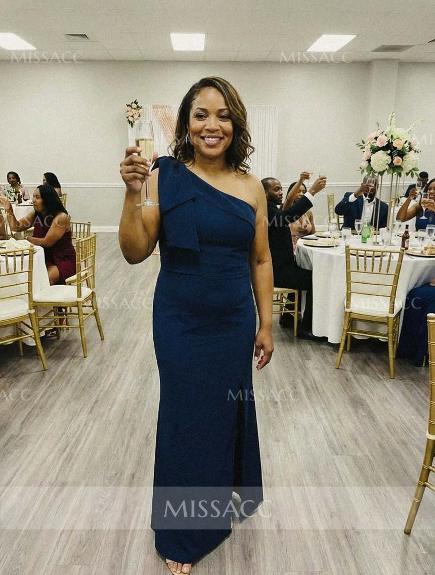 Luxurious satin mother of the bride dress with a chic one-shoulder design, featuring an elegant sheath silhouette and a stylish bow detail. Perfect for a wedding celebration.