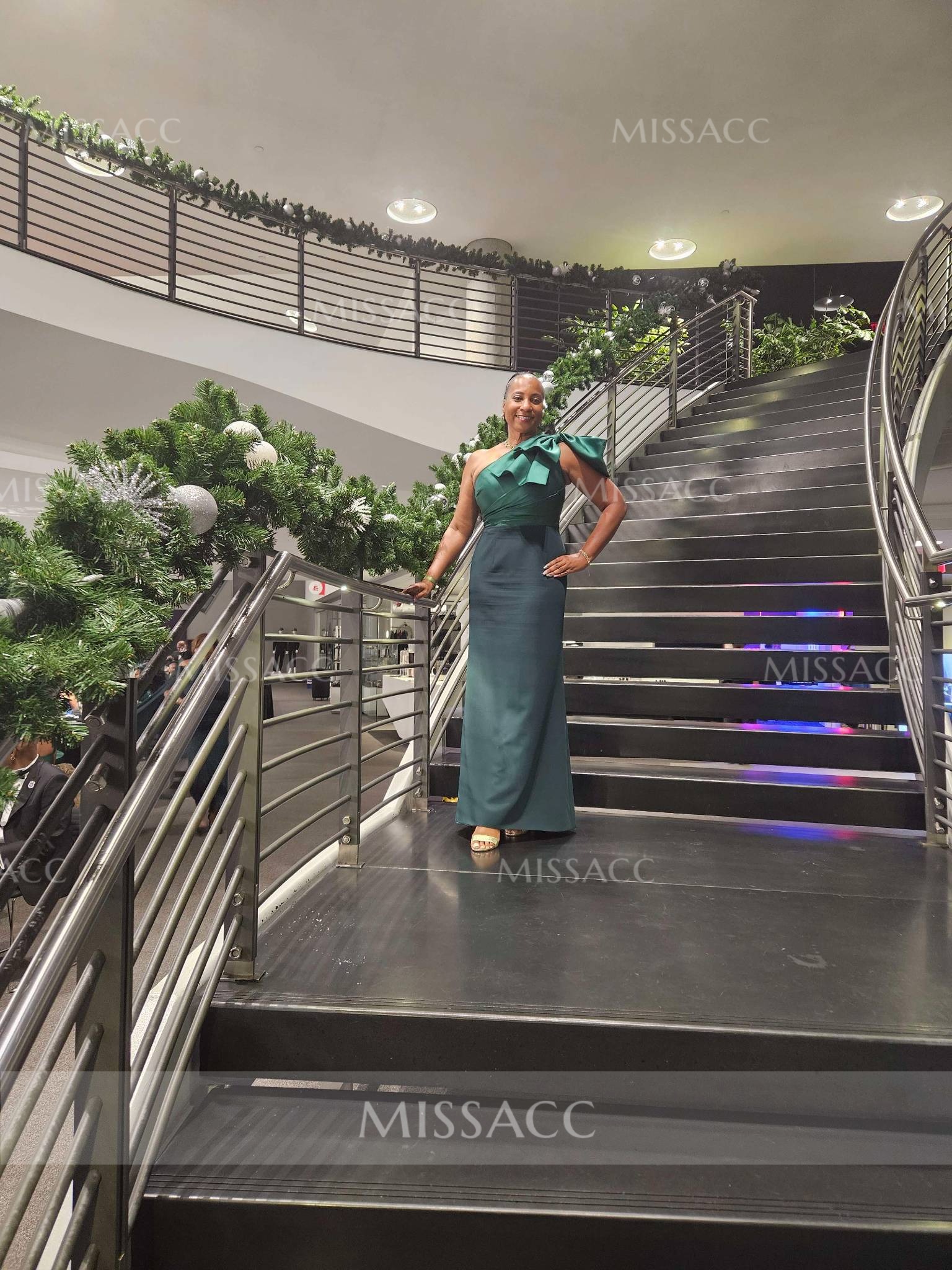 Elegant sheath column dress with a modern one-shoulder design, featuring a satin bow for a sophisticated mother-of-the-bride look at special occasions.