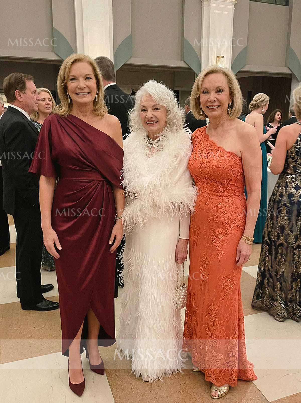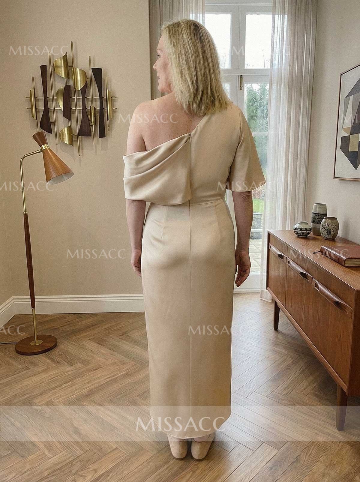 Intricate pleated stretch satin knit sheath dress with a chic one-shoulder design, perfect for evening events. Luxurious fabric, elegant silhouette, versatile style.