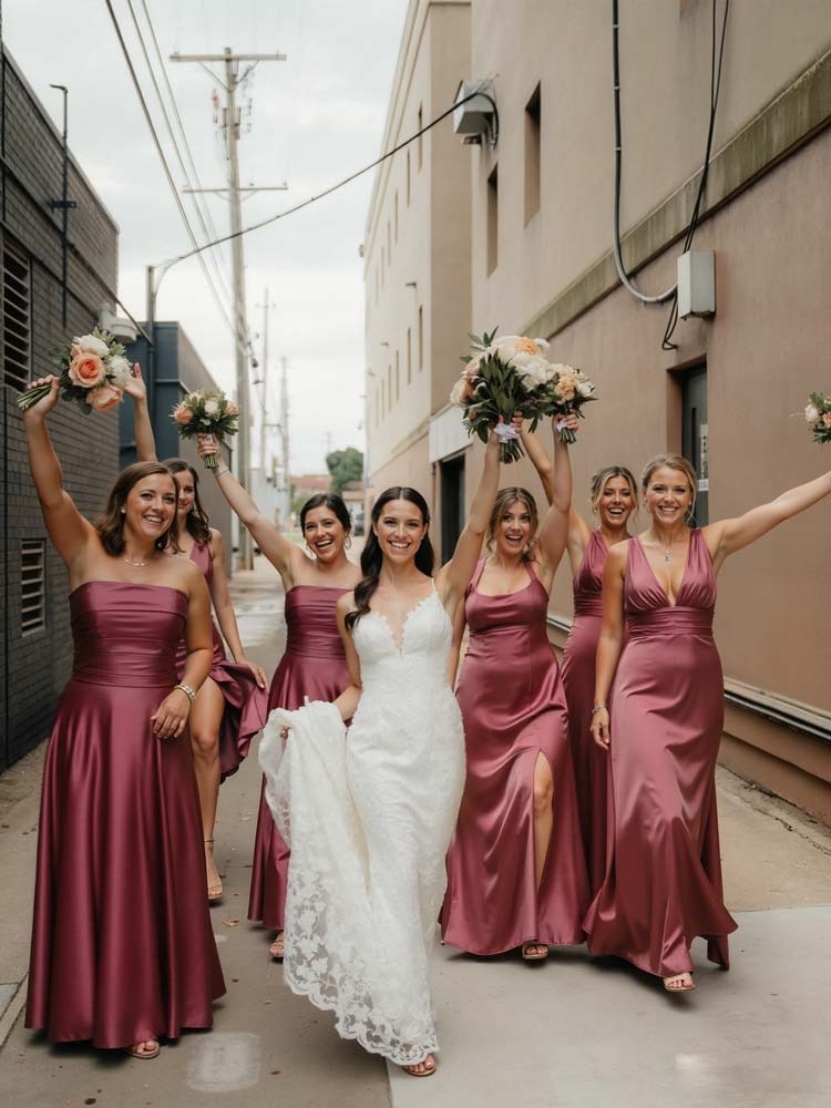 Discover our chic one-shoulder bridesmaid dresses, crafted from silky satin with a flattering column silhouette and split front detail. Perfect for weddings and formal events.