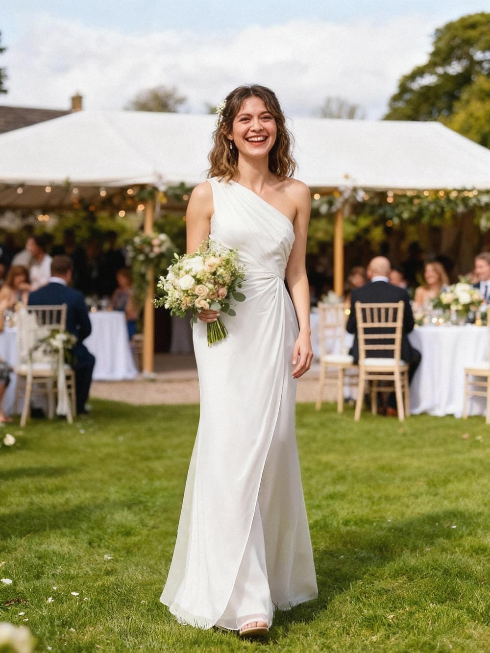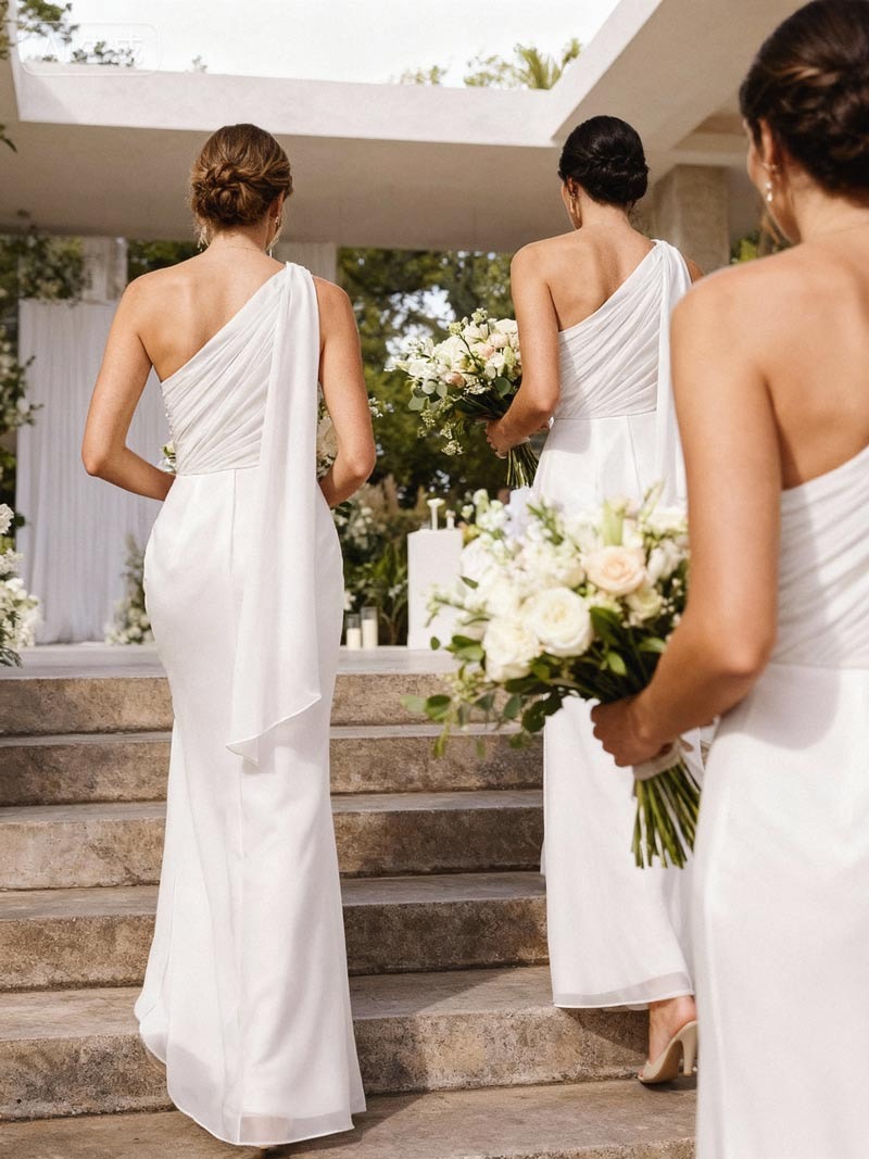 This dress was a surprisingly good fit for our last-minute wedding. I usually struggle with online shopping, but this one worked out. The chiffon fabric is nice and flowy, not too heavy. It draped really well, which was a relief since I’m a bit self-conscious. The one-shoulder design is pretty classic and didn’t feel too revealing for a wedding. Honestly, I was expecting it to be just okay, but it actually looked pretty sophisticated. Definitely a solid option if you need a chic bridesmaid dress without a huge hassle. It's elegant enough for a formal event.