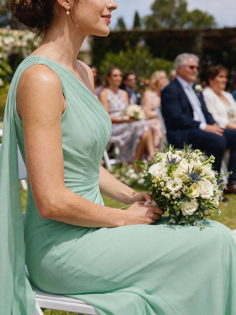 This dress was a good option for a recent wedding I was in. The chiffon material is flowy and feels nice against the skin, which is always a plus for long events. I liked the one-shoulder style; it’s elegant and adds a little something extra without being too much. The sheath, floor-length design is pretty classic and worked well for the wedding ceremony and reception. It gave a cohesive and sophisticated look to the bridal party. It’s a reliable choice if you want something that looks polished.
