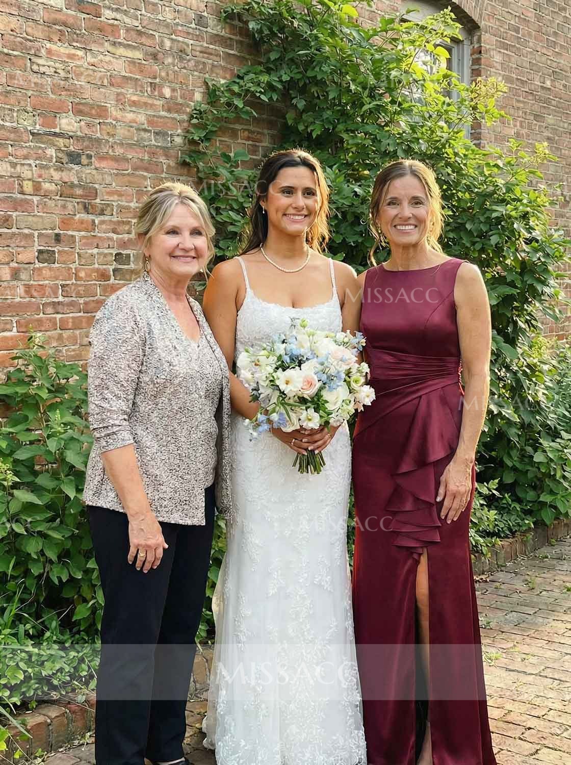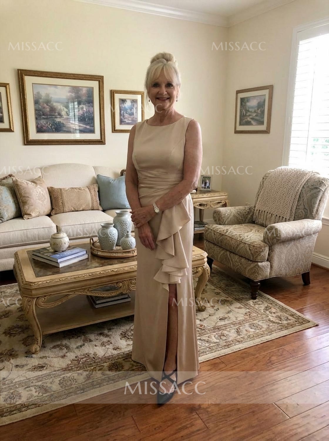 The mother of the bride dress is a hit! The fabric is high-quality and the ruffle adds a feminine touch. The high split is a bold choice, but it works. It's a bit more revealing than I initially thought, but it's a great dress for a special event.