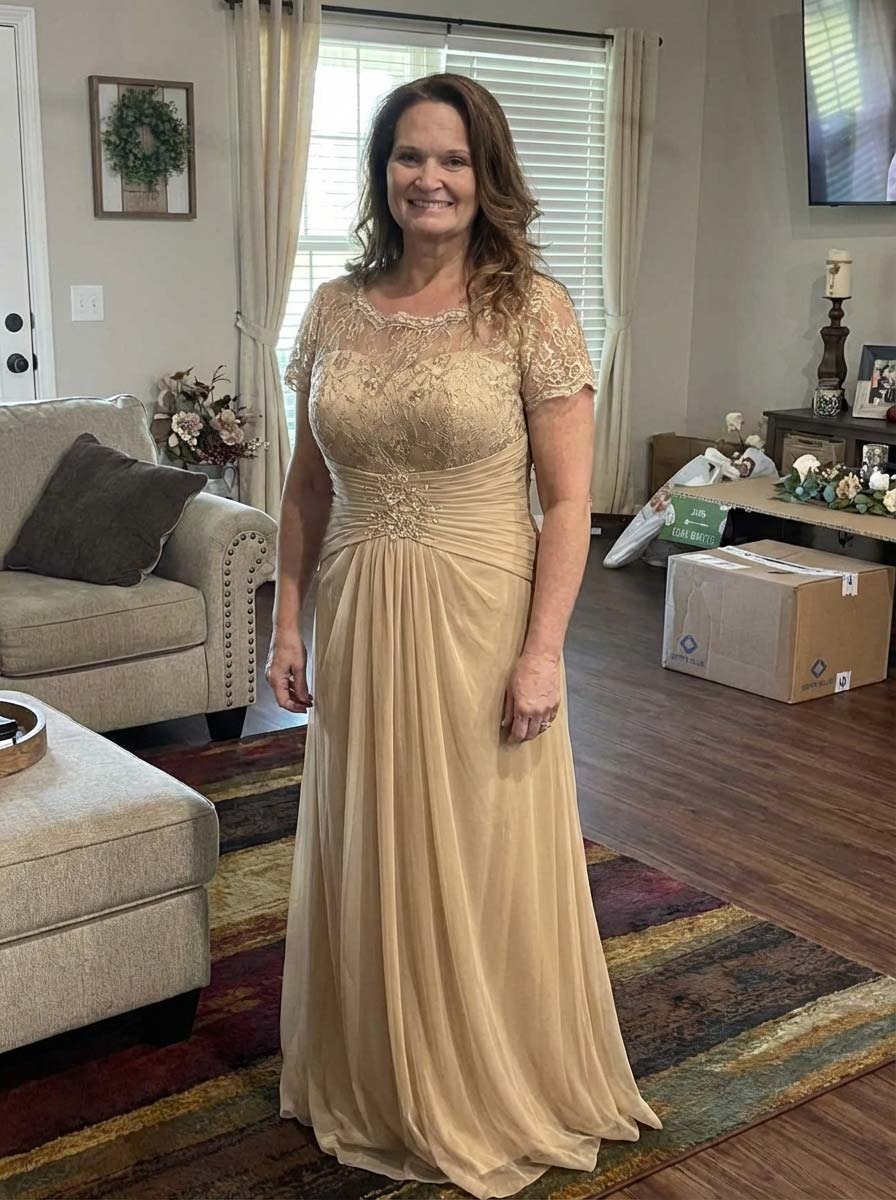 Achieve a stunning appearance and a delightful feeling in the mesmerizing formal gown. This dress features an enchanting scoop neckline paired with lovely lace short sleeves. Its elegant back is secured by a zipper, ensuring a polished look. The top is adorned with captivating lace embellishments, while the full-length column skirt emanates sophistication with its simple yet refined appearance. This dress is the epitome of elegance for your evening event.