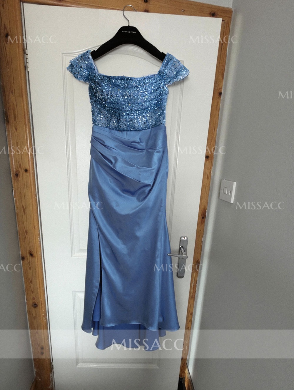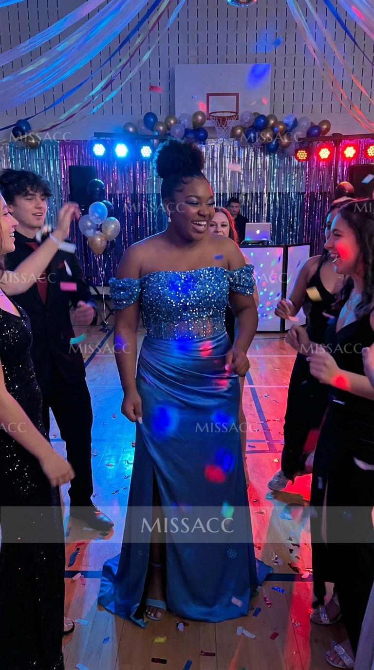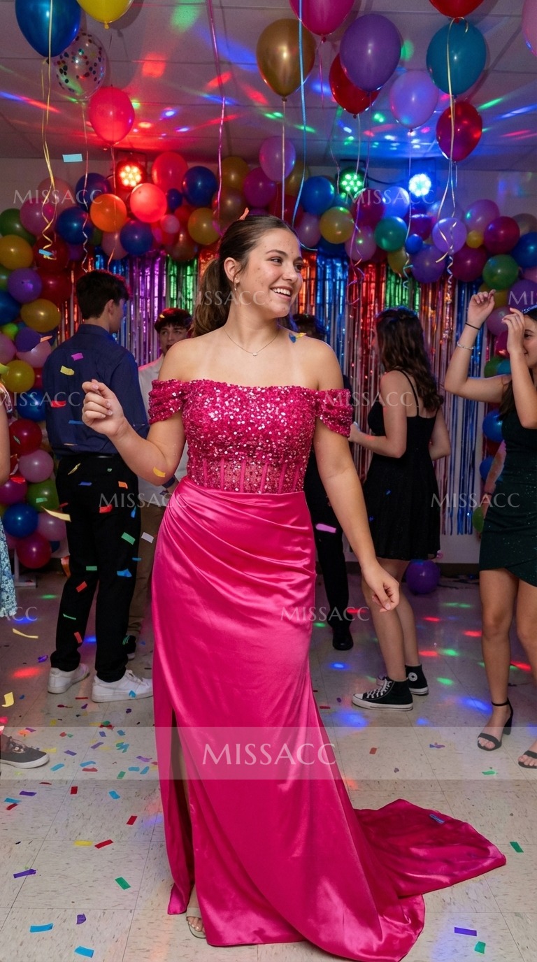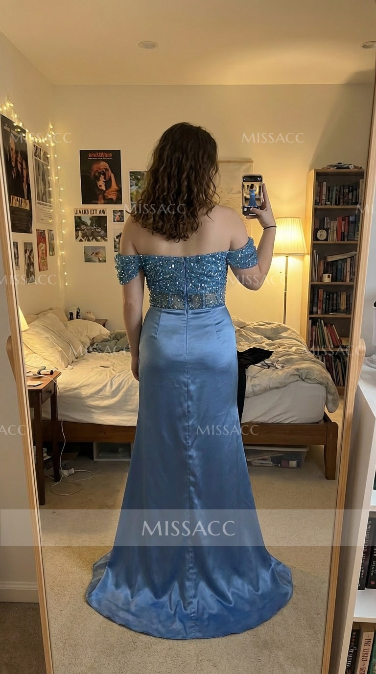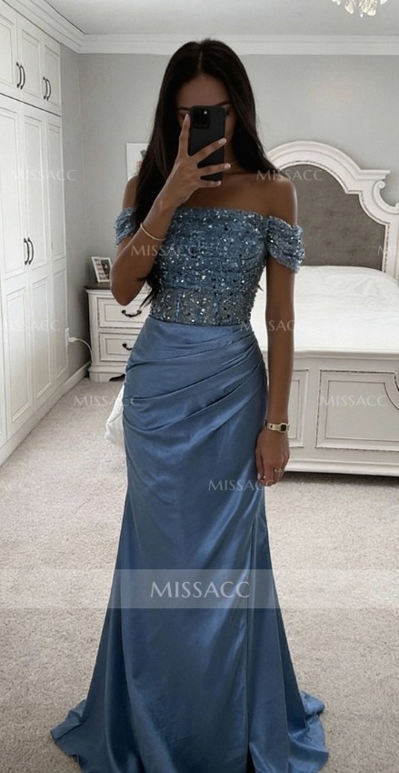 Stunning sheath column satin prom dress with a high split, featuring a sequined bodice for a dazzling evening look. Perfect for proms and special events.