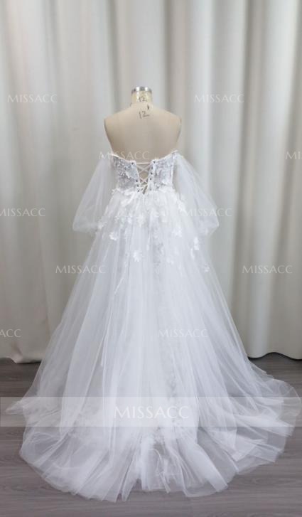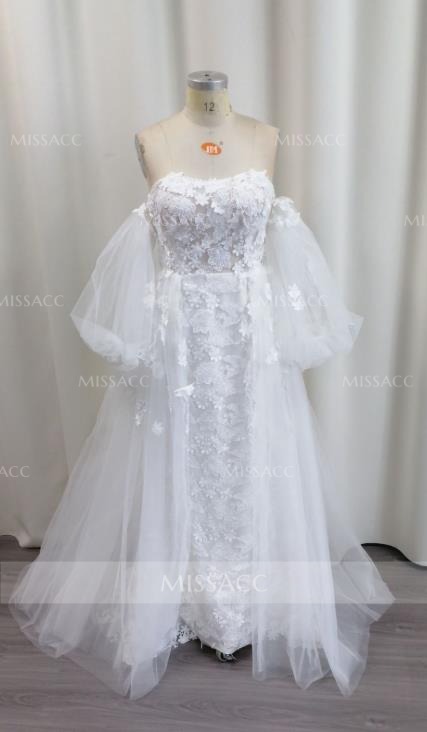 Elegant Sheath Column Wedding Dress with Strapless Long Sleeves, crafted in lace and tulle for a romantic allure. Perfect for a dreamy ceremony.