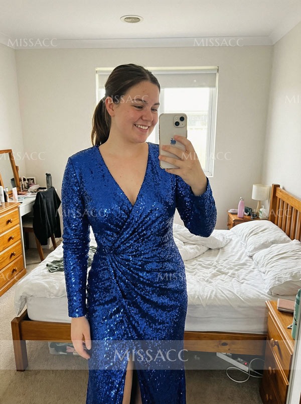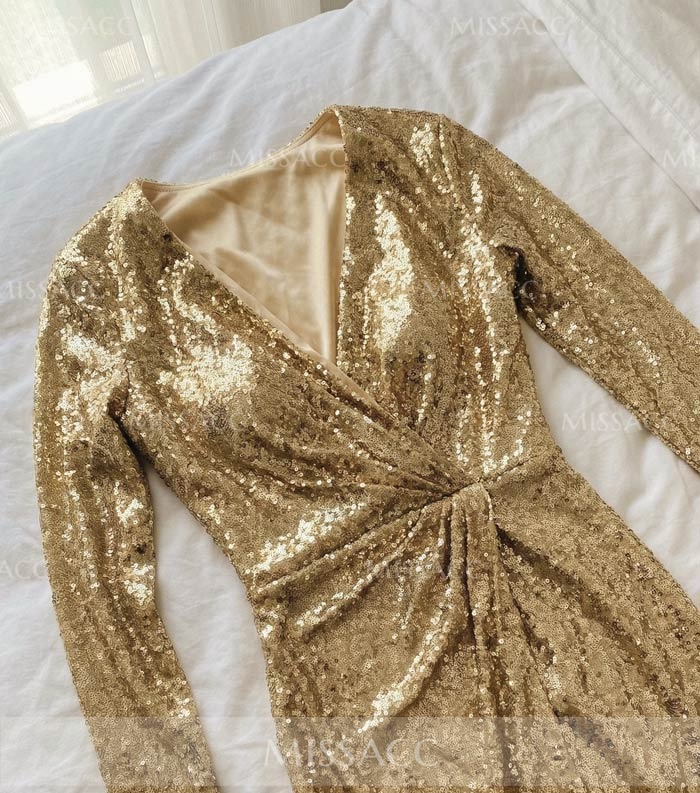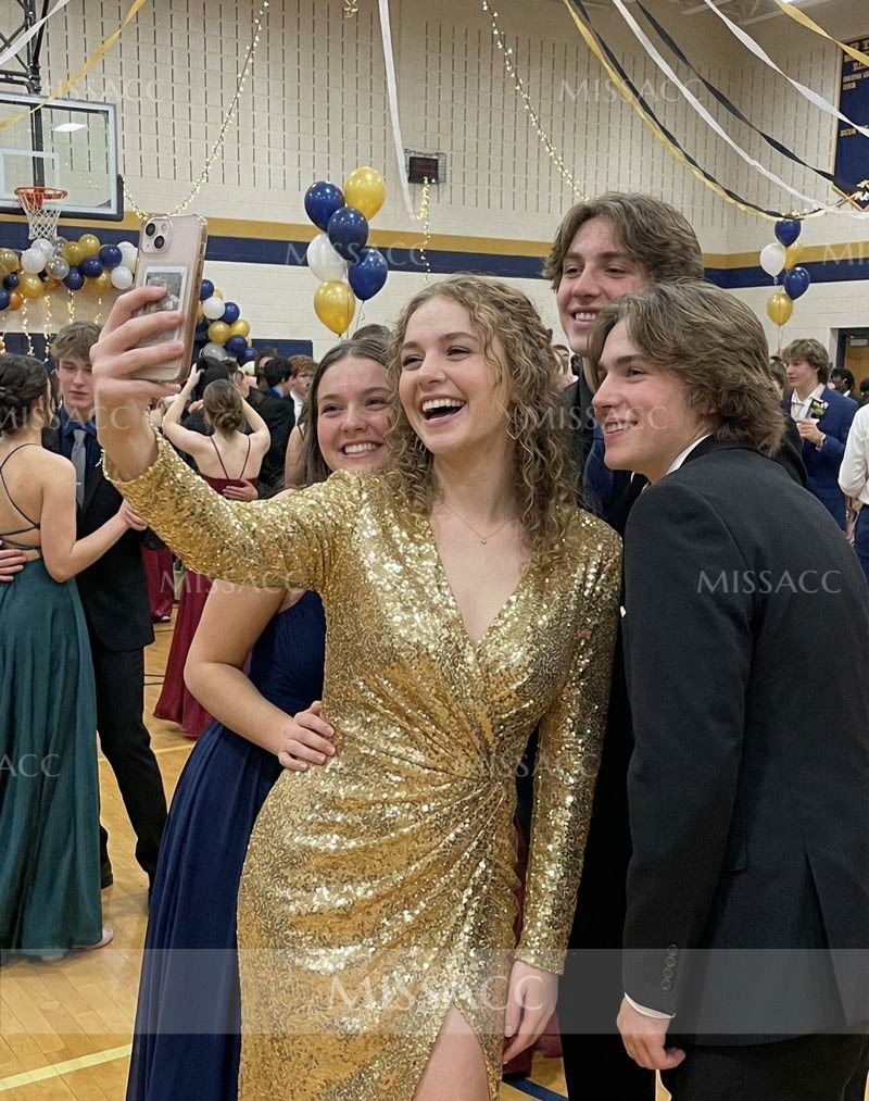 Stylish sequined sheath dress featuring a column silhouette and v-neck design for a dazzling prom night look.