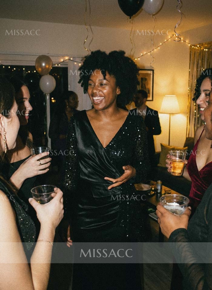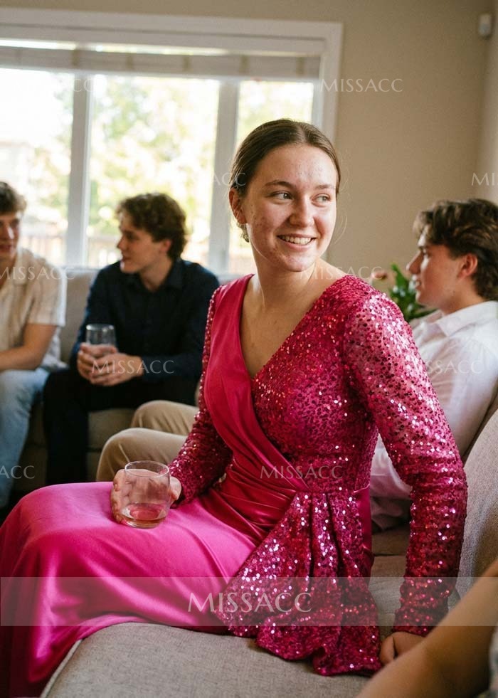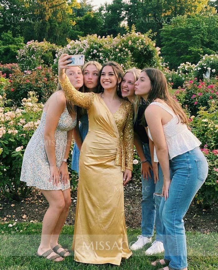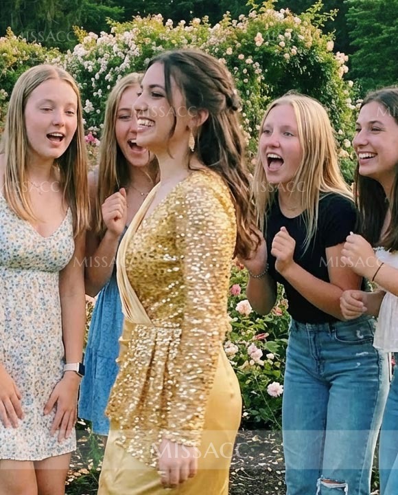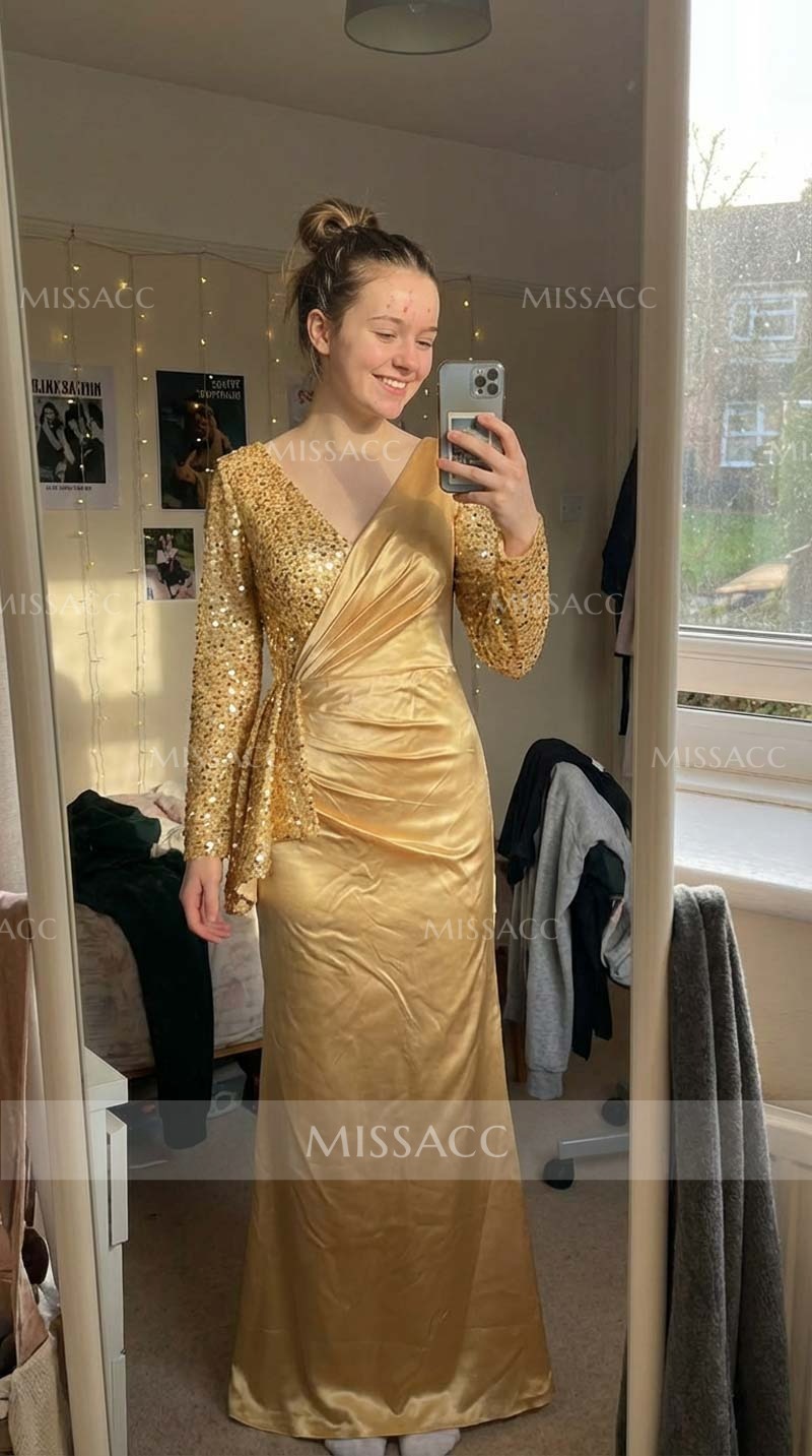 Loved this dress! The sheath style and v-neck cut are really flattering. The sparkle and long sleeves add a unique touch, and the train sweeps elegantly. Got loads of compliments at prom night. Great purchase!