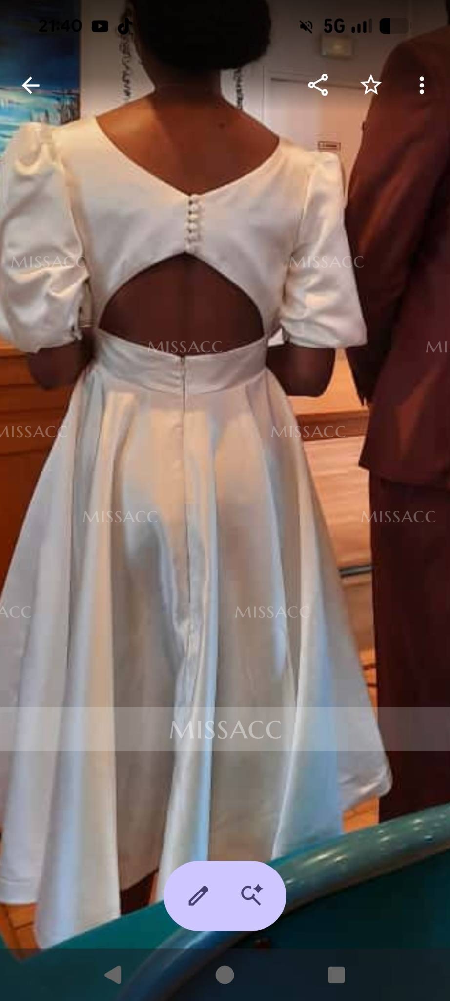I'm really happy with the dress I got. It's a short chic wedding dress that's perfect for a less formal wedding. The satin back hole is a nice feature, it's not too flashy but adds a bit of flair. The dress is a bit shorter than I thought, but it's a nice change. A bit pricey, but I think it's worth it for the style.