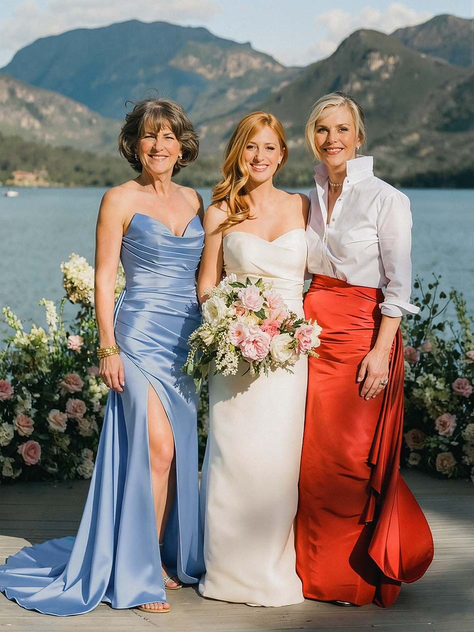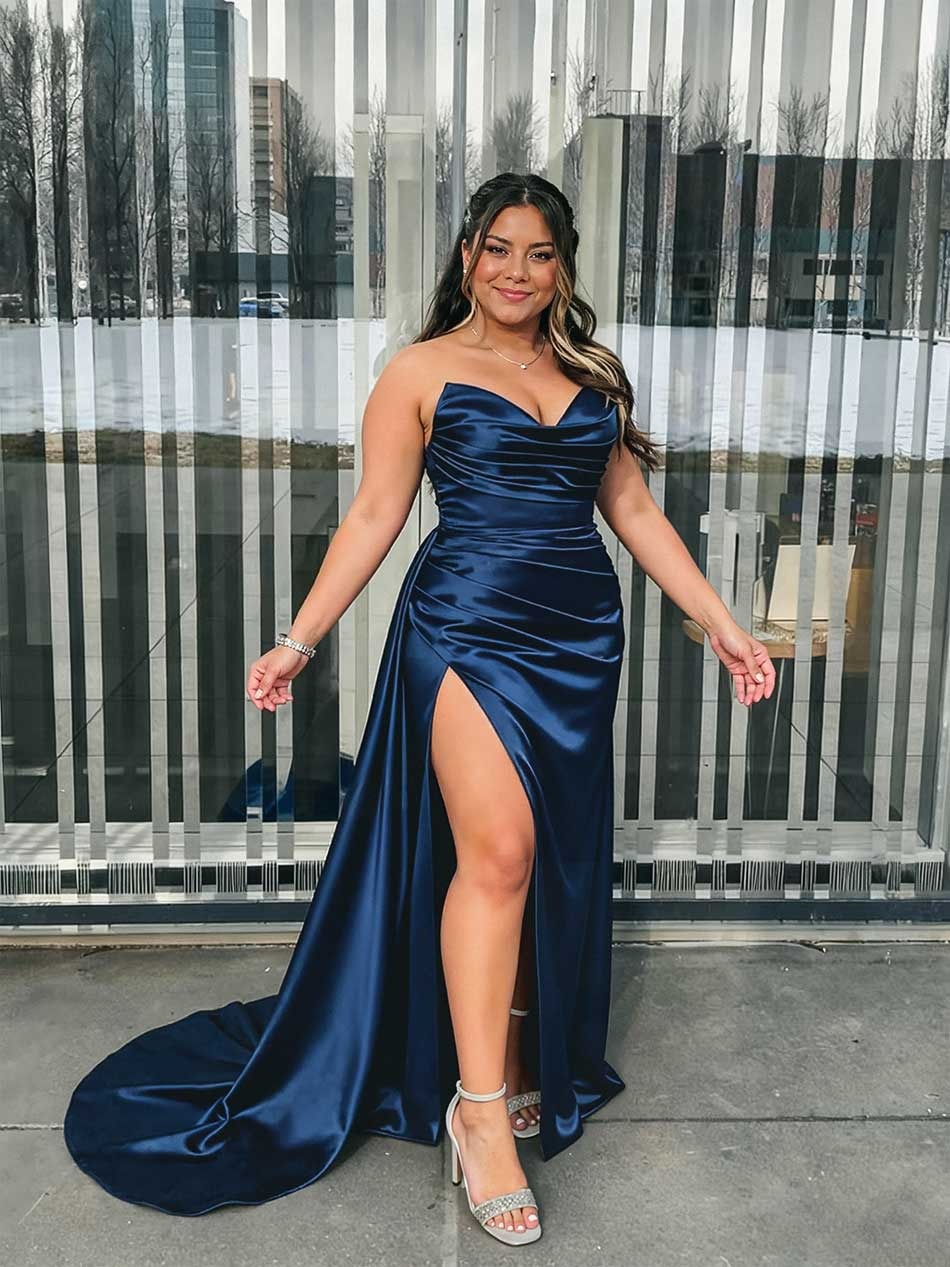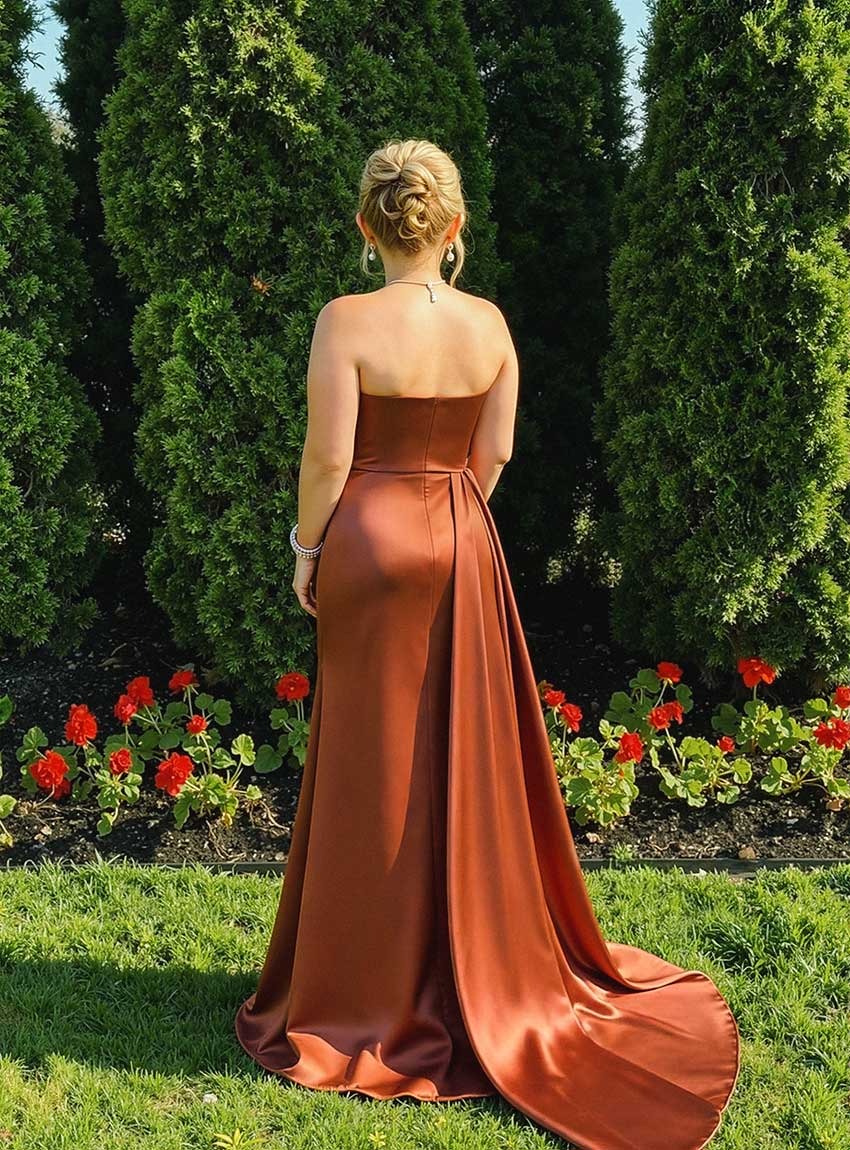 The perfect choice for making a statement at any formal event, discover sophisticated glamor with our strapless satin evening dress. The high slit adds a touch of drama, allowing you to stride with elegance and capture the attention of the room. Ideal for weddings, dinners or any black tie occasion, this dress is a timeless choice for exuding elegance and glamor.