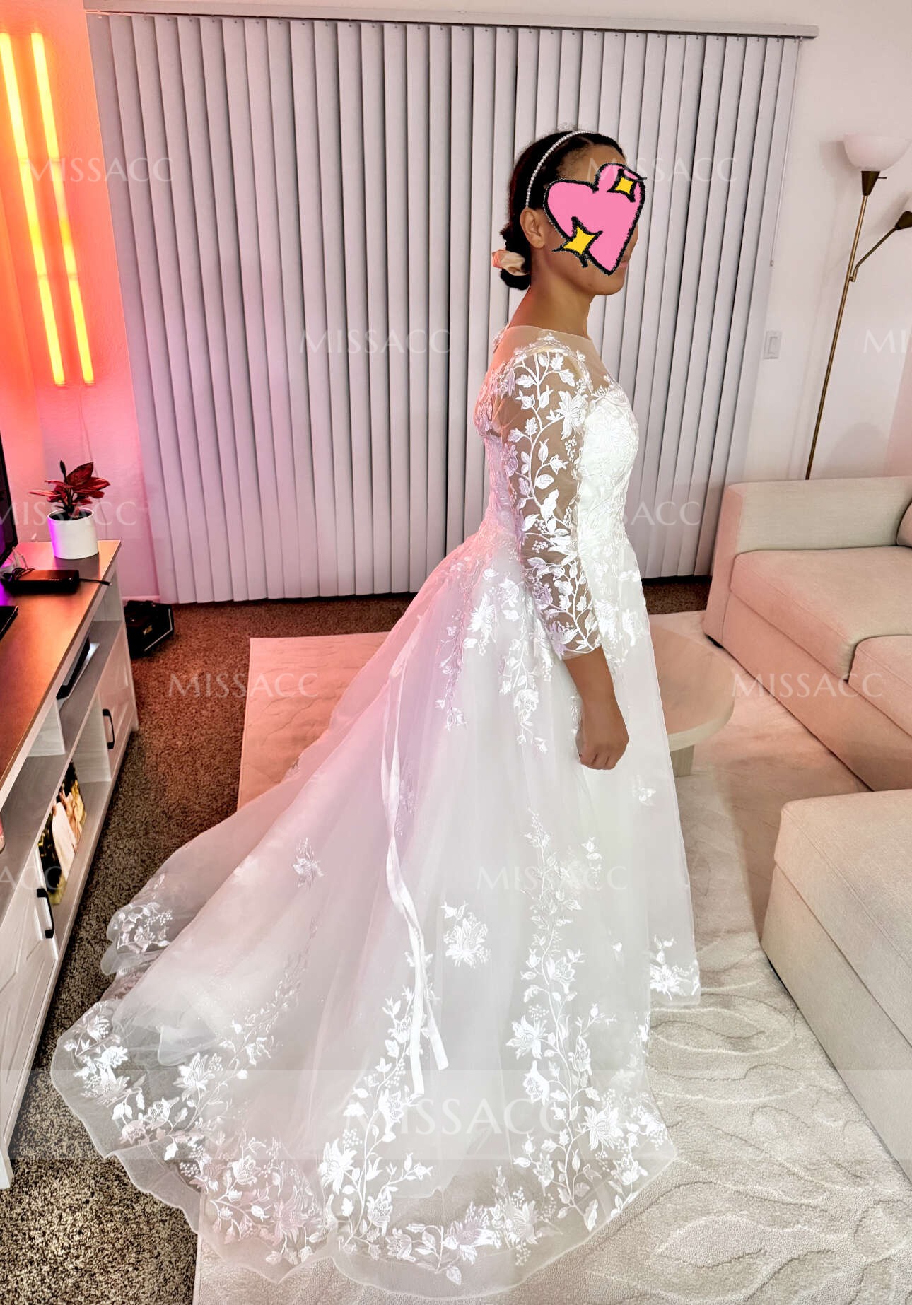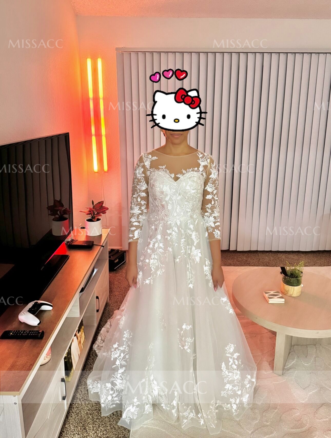 Got this delivered and tried it on in the living room with my mom. I was a little worried about buying a dress online without trying it on first, but the fit is spot on. The V-neck sits perfectly without being too revealing, and the long sleeves are surprisingly comfortable to move around in. It feels really nice against the skin, not scratchy at all like some tulle fabrics can be. My mom actually teared up a bit when she saw the sweep train. Absolutely thrilled with how it hugs my curves.