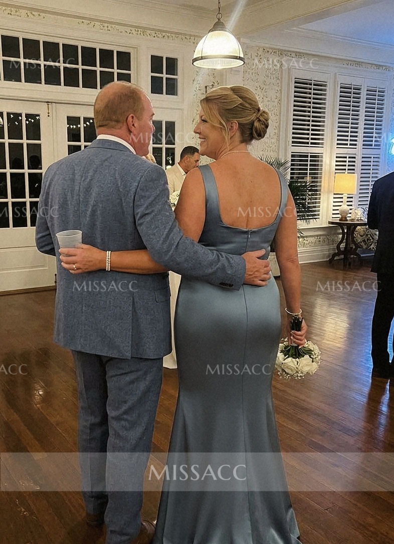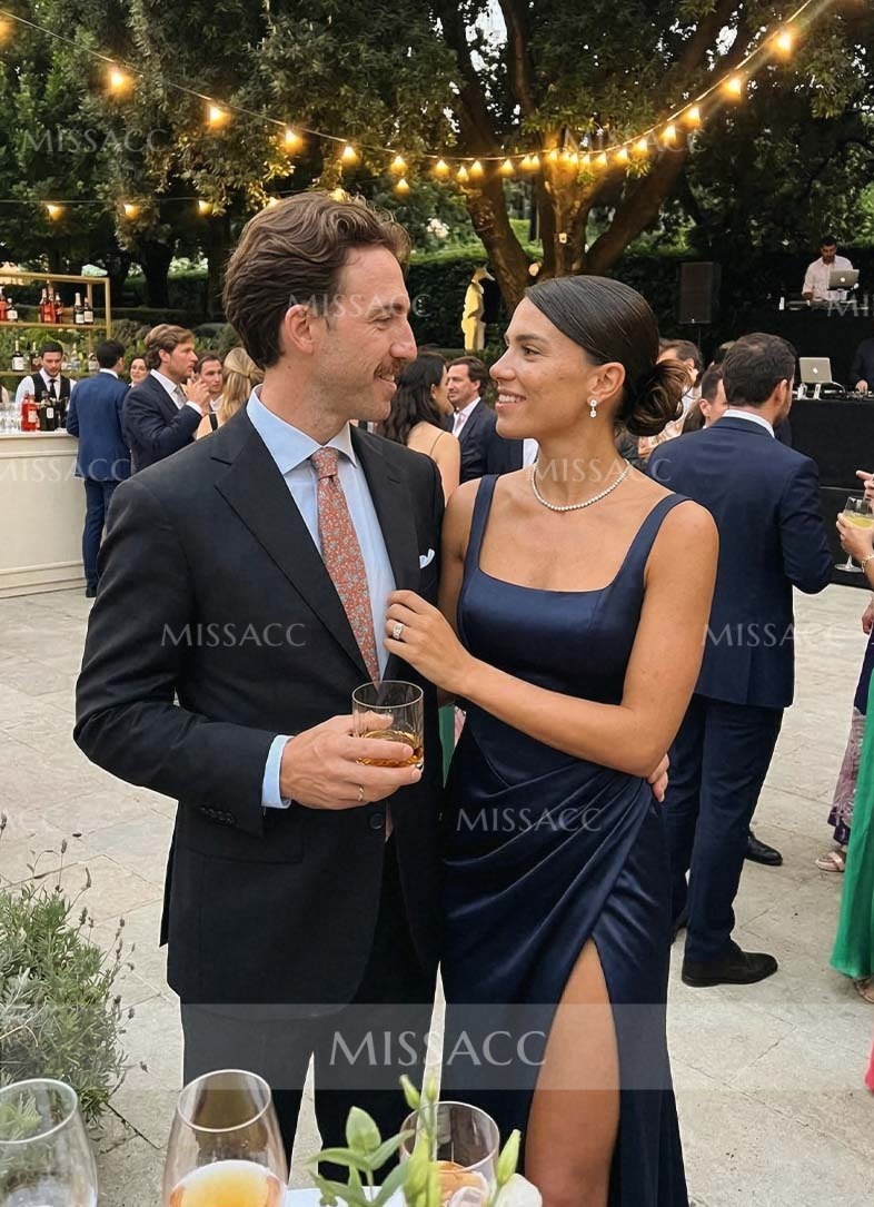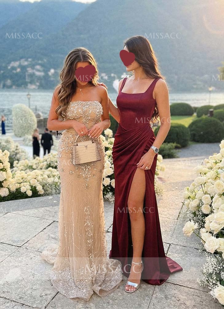 This evening dress offers a refined look with a traditional aesthetic, giving a glam twist. This lovely silk like satin gown has a sleeveless, square neckline, and a zipper up back. The sheath skirt is tailored with a high slit and finished with a sweep train for added drama. When you want to look stylishly spectacular, this evening dress is an excellent choice!