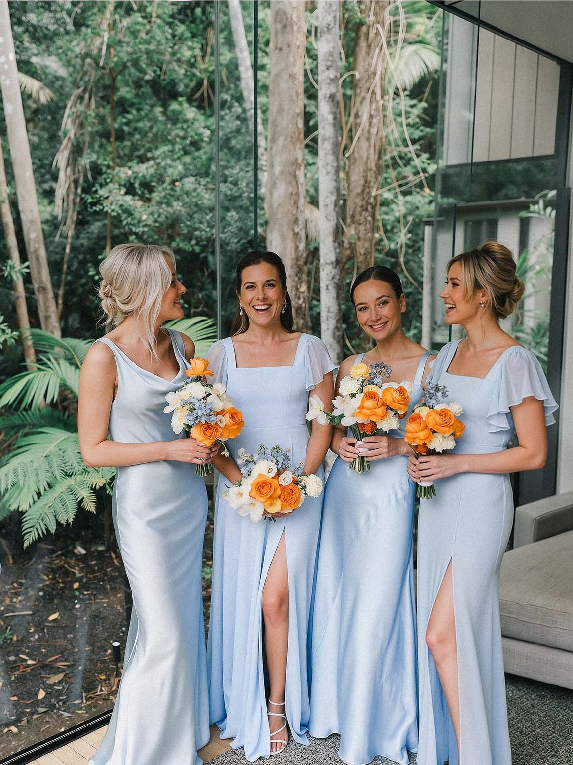 This is our gorgeous bridesmaid dress cut from chiffon. She features a square neckline with flutter sleeves and a self tie scoop back. The look is complete with an A-line skirt paired with a leg slit.