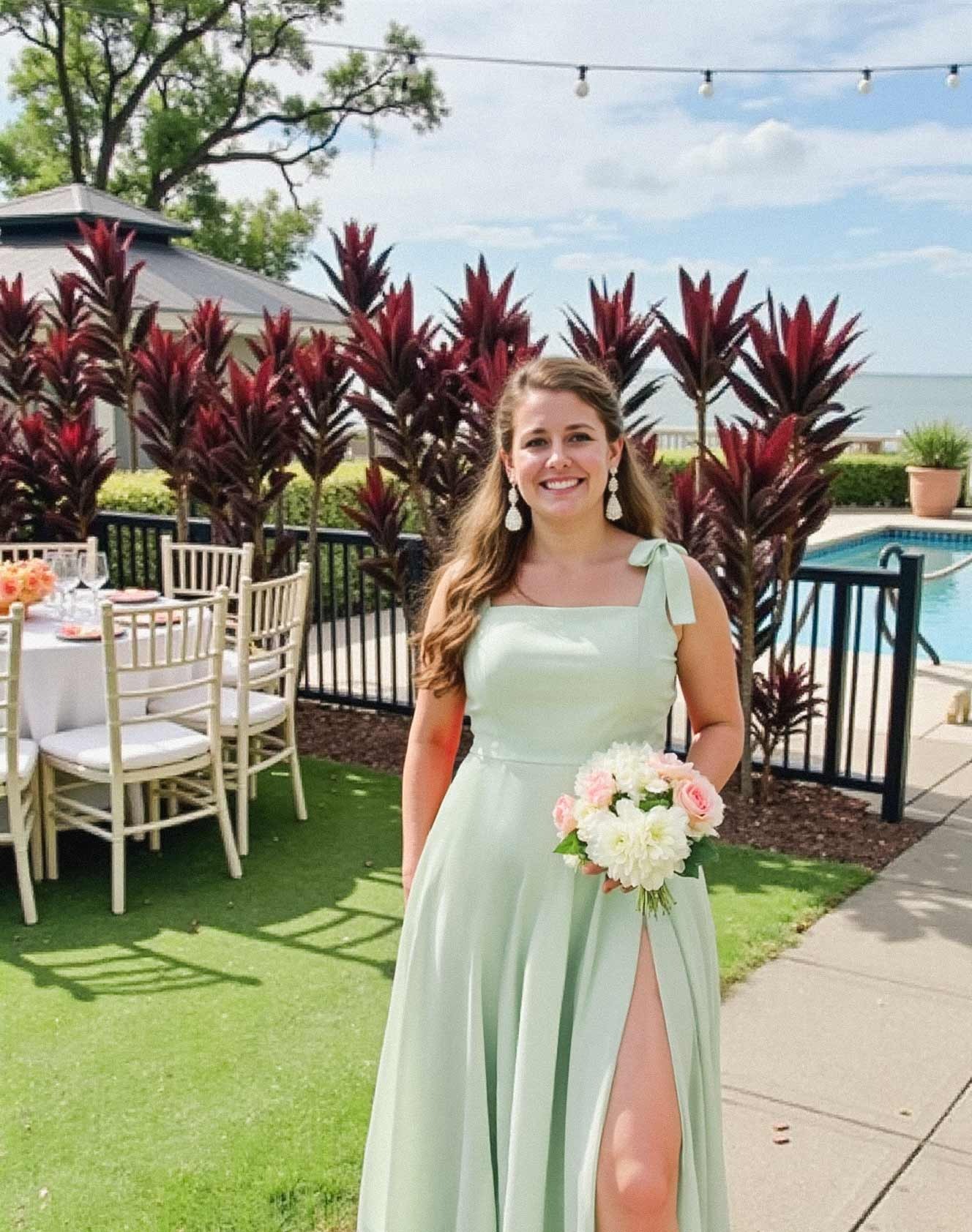 This dress exudes an elegant temperament with its smooth contours and delicate details. The front features a square neckline, paired with elegant bow straps, creating a unique and playful atmosphere. The slit adds a touch of delicacy, highlighting a refined and bold style. Moving to the back, the design presents a simple and elegant appearance, equipped with clean zipper closures and equally charming bow shaped shoulder straps, ensuring comfortable wearing. The skirt is elegant and natural, showcasing graceful dance moves with every step. This dress perfectly balances modern style and classical charm.