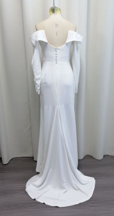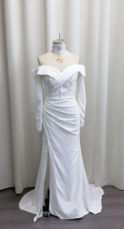 Man, this dress is just so beautiful! The satin fabric feels so luxurious and the off-the-shoulder design gives it a real classic touch. I wore it for my wedding and let me tell you, I felt like a real princess. The long sleeves are perfect for a winter wedding. Also, the mermaid cut of the dress really hugs your body in all the right places. Honestly, couldn't have asked for a better dress for my big day!