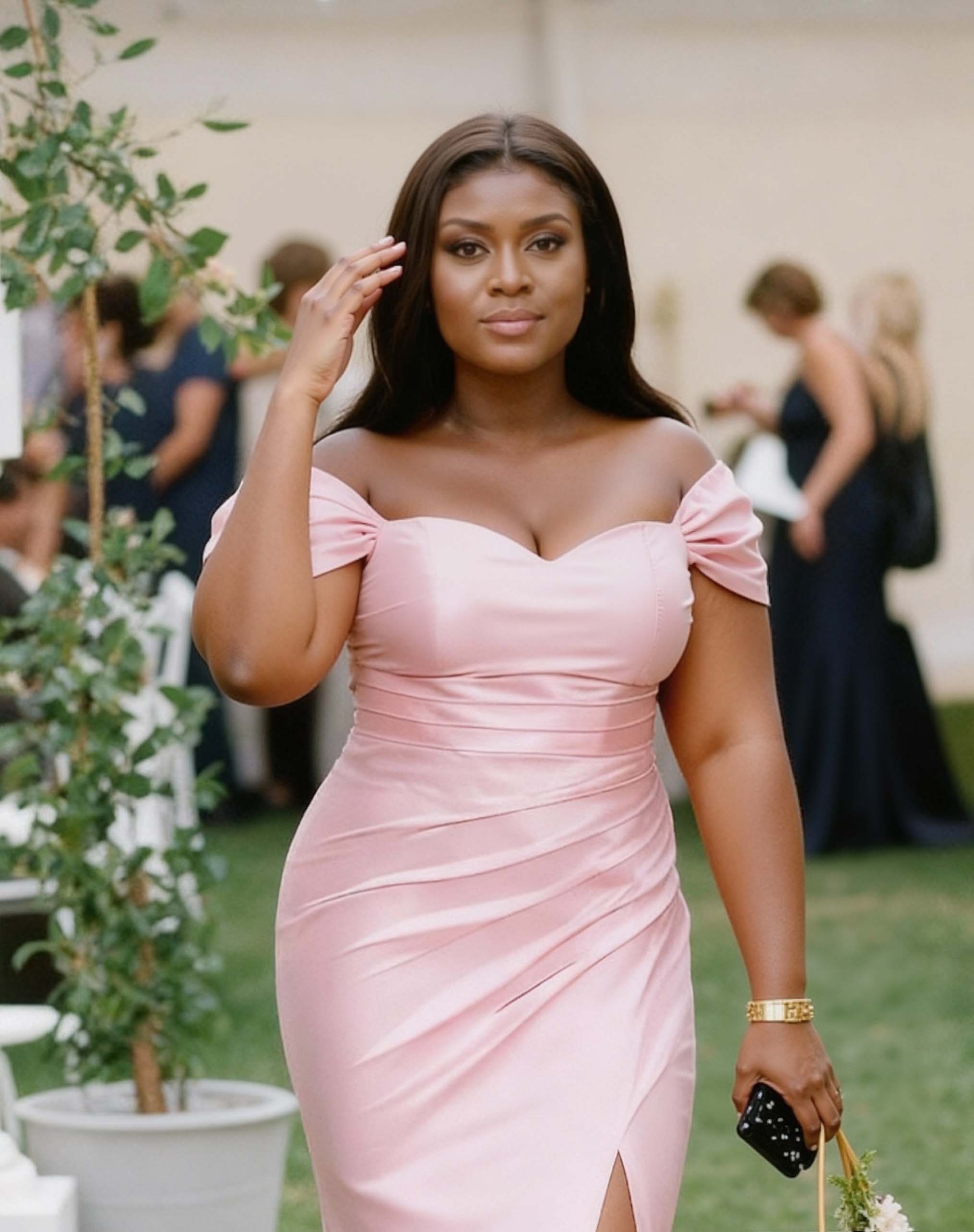 What a gorgeous dress! The fabric feels so luxurious, and it fits perfectly. The off-the-shoulder style is incredibly flattering, and the front slit adds a unique touch.
