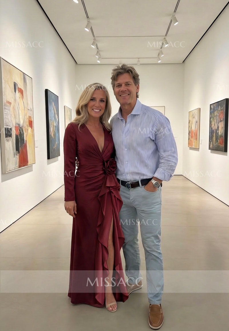 Make a statement at your next formal event with this Trumpet Mermaid Crepe Satin Evening Dress. Featuring a daring plunge neck, long sleeves, and a high split adorned with delicate flowers, this floor-length gown is perfect for proms and black-tie galas. Shop this sophisticated look today.