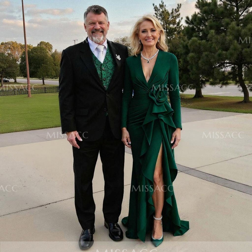 Discover timeless grace in this stunning Mermaid Mother of the Bride dress. Crafted from luxurious crepe satin, it features a flattering plunge neckline, elegant long sleeves, and a dramatic high split skirt. Designed with delicate floral accents, this floor-length gown offers sophisticated style for your special celebration. Perfect for formal events and weddings.