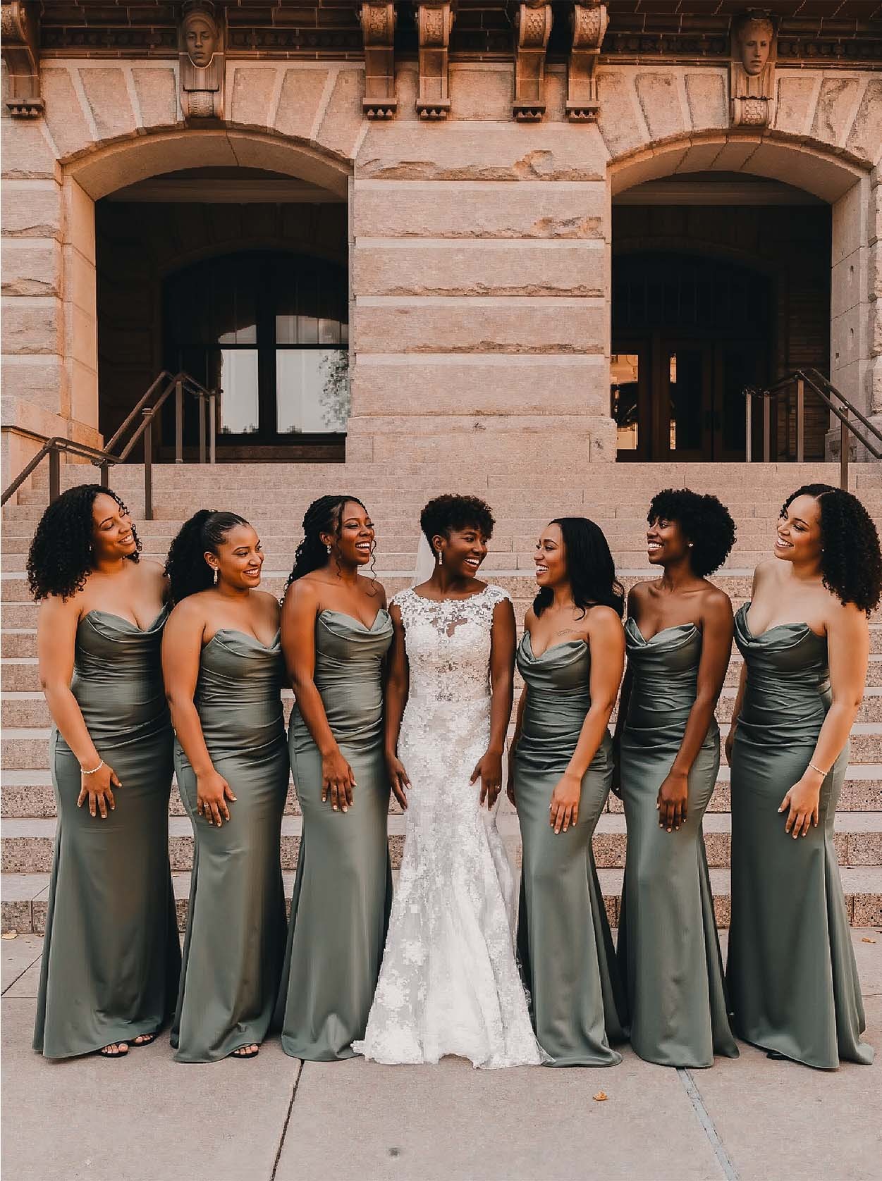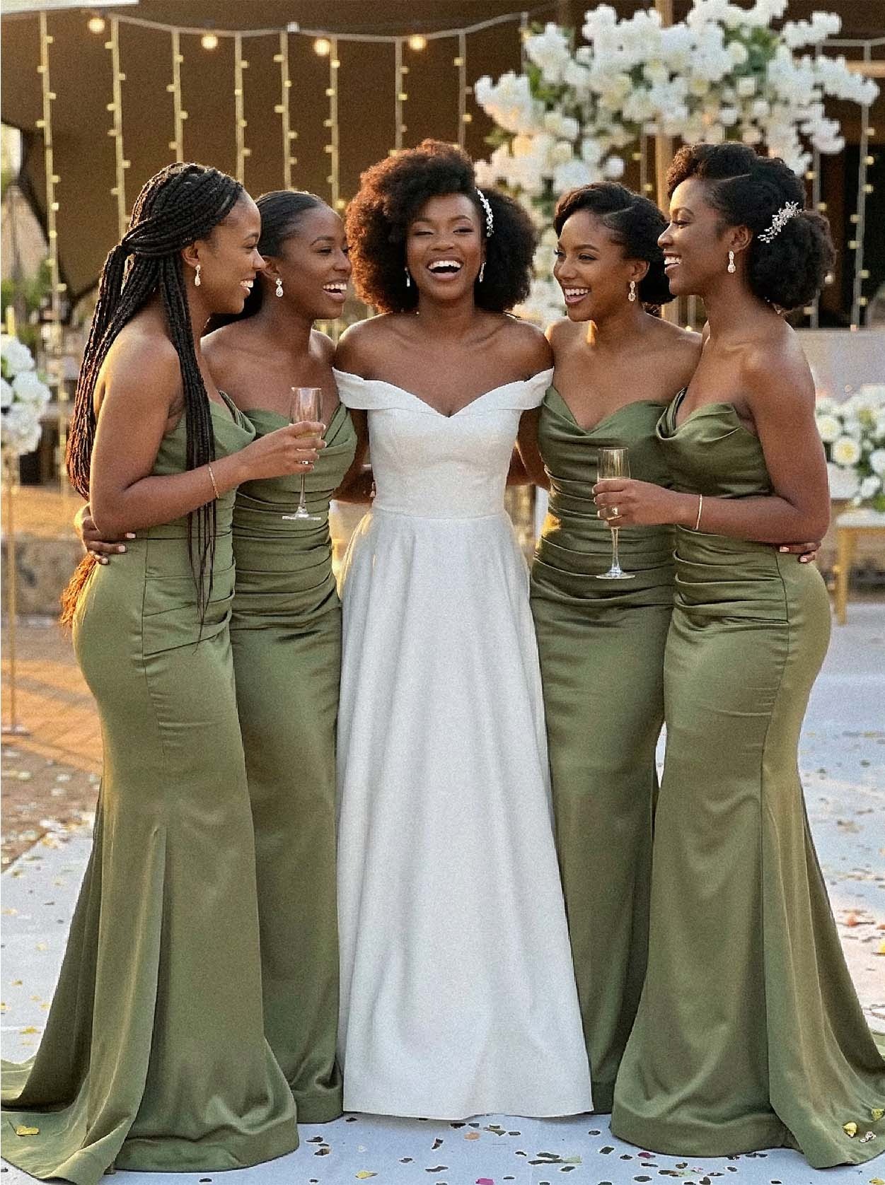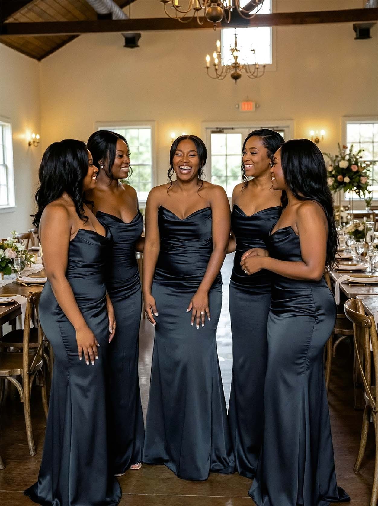 Discover our Mermaid V-Neck Satin Bridesmaid Dresses, designed for a sleek silhouette and floor-length elegance, perfect for weddings and formal events. Luxurious satin fabric ensures comfort and style.