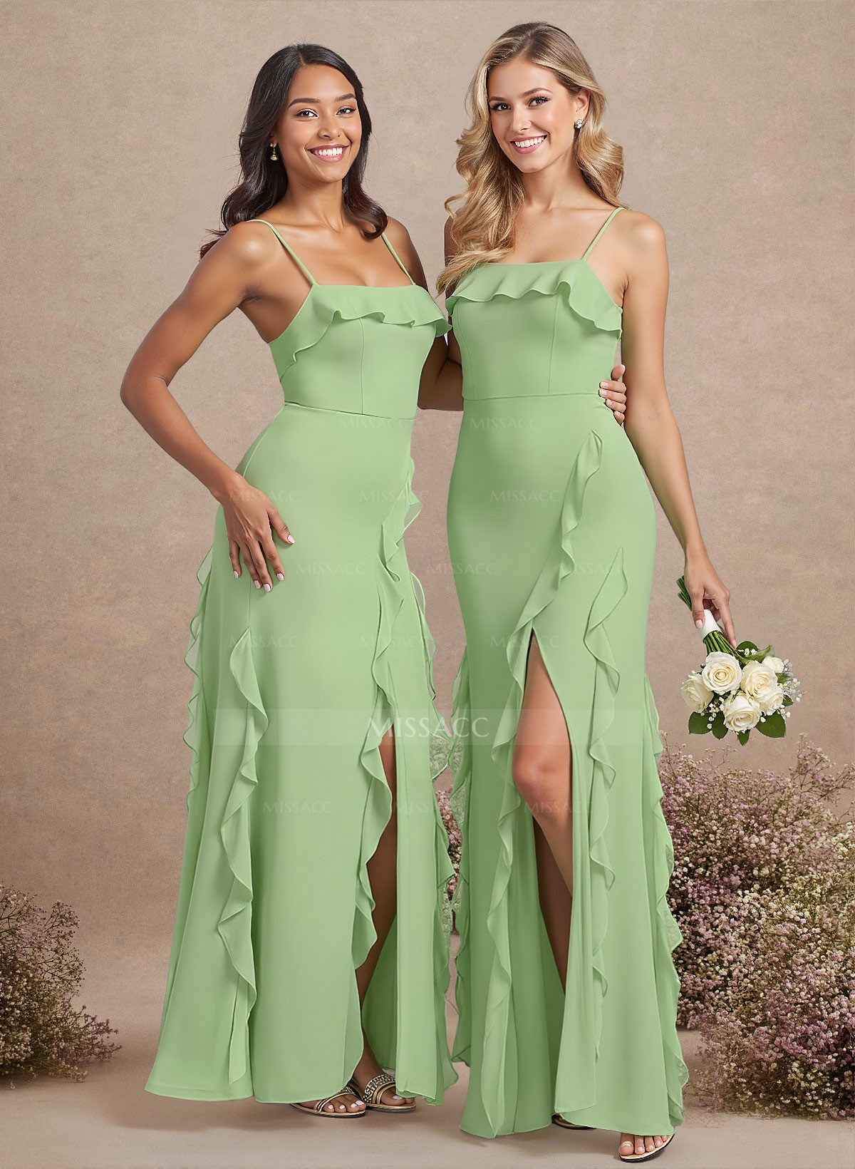 Unique Ruffle Square Neckline Floor-Length Chiffon Bridesmaid Dresses With High Split #SBD11477